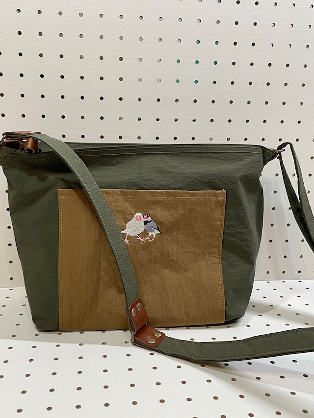 【お届け時期】 7日~14日ほどお時間をいただいています。 ------------------------------------------------------------------ 軽くて強くて撥水加工されてて自立するのに手触り最高でお手入れ簡単という、こだわり強めの私が一目惚れした小松マテーレさんが開発したKONBUという名前の新素材生地でつくったショルダーバッグです。 まず驚いていだけると思うのが、軽さです。 190g前後というバナナ1本分と変わらないほどの軽さのショルダーバッグが出来てしまいました! スマートフォンもすっぽり入る大きめの外ポケットがひとつ。 中にも端から端まで使って2つのポケットがあります。 また、日傘や水筒も入るようなマチと深さにしました。 (iPadもギリギリ入ります) ストラップもすべてKONBUにしましたので、汗や雨の日にも撥水加工なので安心ですね! ※使用していると徐々に撥水効果は弱まるので、時々防水スプレーをしていただくことをお勧めします。 負荷のかかる要所要所は栃木レザーでしっかりと固定しています。 丈夫なKONBUと丈夫な革でとっても丈夫で軽いショルダーバッグができました! また、当店オリジナルの刺繍は、7種類。 セキセイインコ・文鳥・オカメインコ・コザクラインコ・スズメ・シマエナガ・ハシビロコウ KONBUカラーは6種類。 ブラック・アイボリー・グレー・カーキ・ベージュ・ネイビー ------------------------------------------------------------------- ★サイズ:横約33cm(ファスナー30cm)×高さ約21cm×マチ約10cm ★生産国:日本 ★主な素材:リサイクルナイロン100%・栃木レザー ★お手入れ方法 ・汚れた場合は、水を含ませた布で硬く絞ってふき取ってください。 ・漂白剤、乾燥機、アイロンの使用はお避け下さい。変質する場合がございます。 ・陽の当らない、風通しの良い場所で保管ください。 ------------------------------------------------------------------- 【KONBU®という生地について】 ●コンブのような独特な質感 海産品の昆布のようなドライ感・締まり感(コン パクト感)が最大の特徴の KONBU® は、1943年創業の老舗化学素材メーカー 小松マテーレ株式会社さんが提案するファブリックの中でも最高レベルの硬度を持っています。 ●驚くほど軽量で、つよい。 一見するとカジュアルな「帆布」のように見えて、持つと驚くほどに軽い。 ナイロン 100% の KONBU® は見た目からは想像できない軽量さが特徴です。 また、引き裂き強度にも秀でてます。 ●自立性-スタンディングファブリック- KONBU® はその軽さと硬度により「スタンディングファブリック」として自立する素材です。生活シーンの中で、「両手が塞がってちょっとバックを置きたい」そんな一コマにも、きっとお役に立てると思います。 ●撥水加工も施しています。 へたりにくい特殊加工+撥水加工も施している優秀な新しいファブリックなのです。 (定期的に防水スプレーをすると効果は更に継続します。)