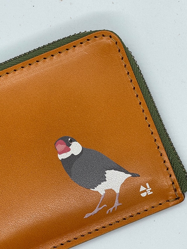 【送料無料】 L字ファスナー財布 文鳥 2羽 キャメル (グリーン) 桜文鳥 白文鳥 財布
