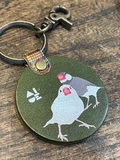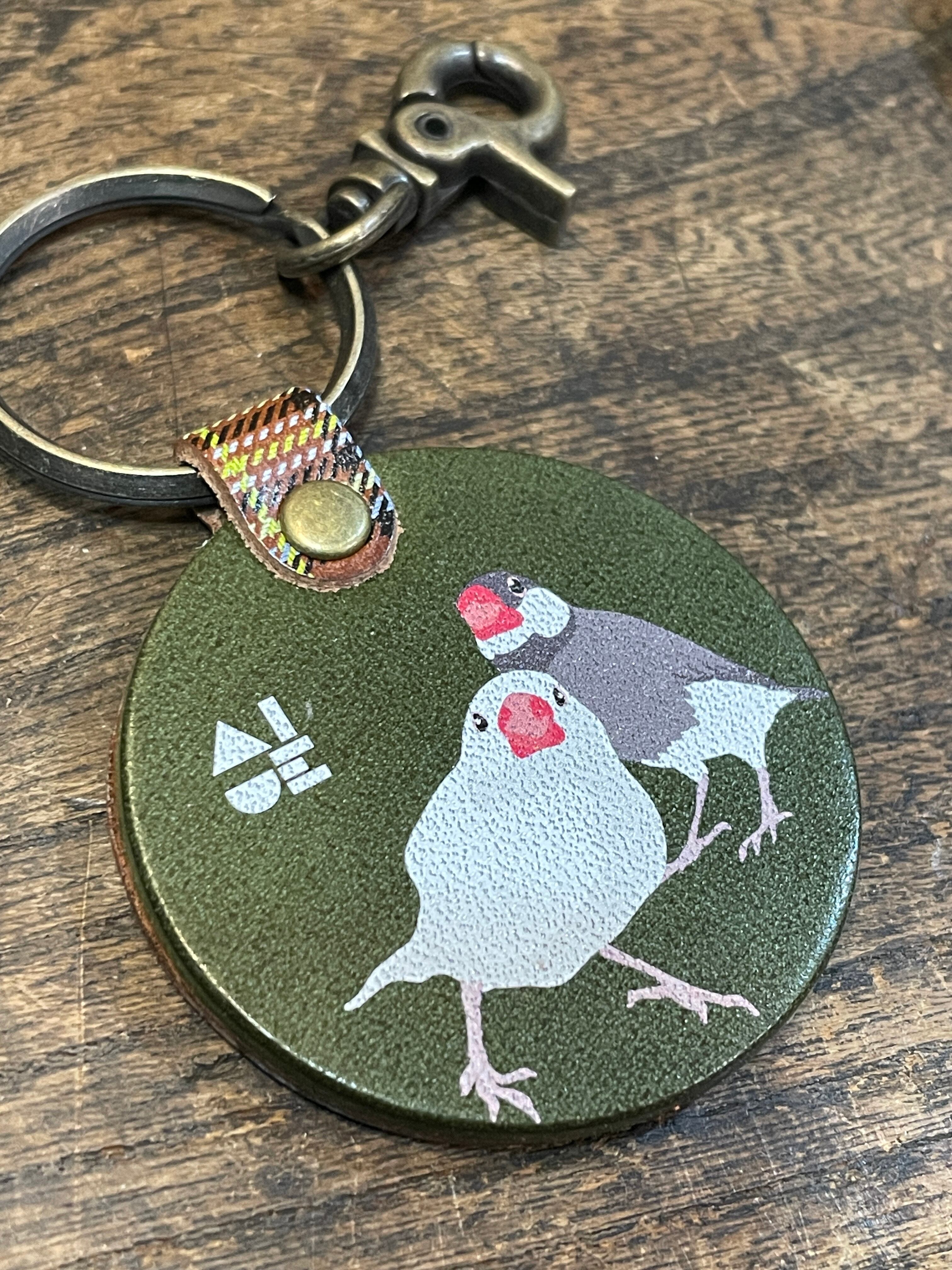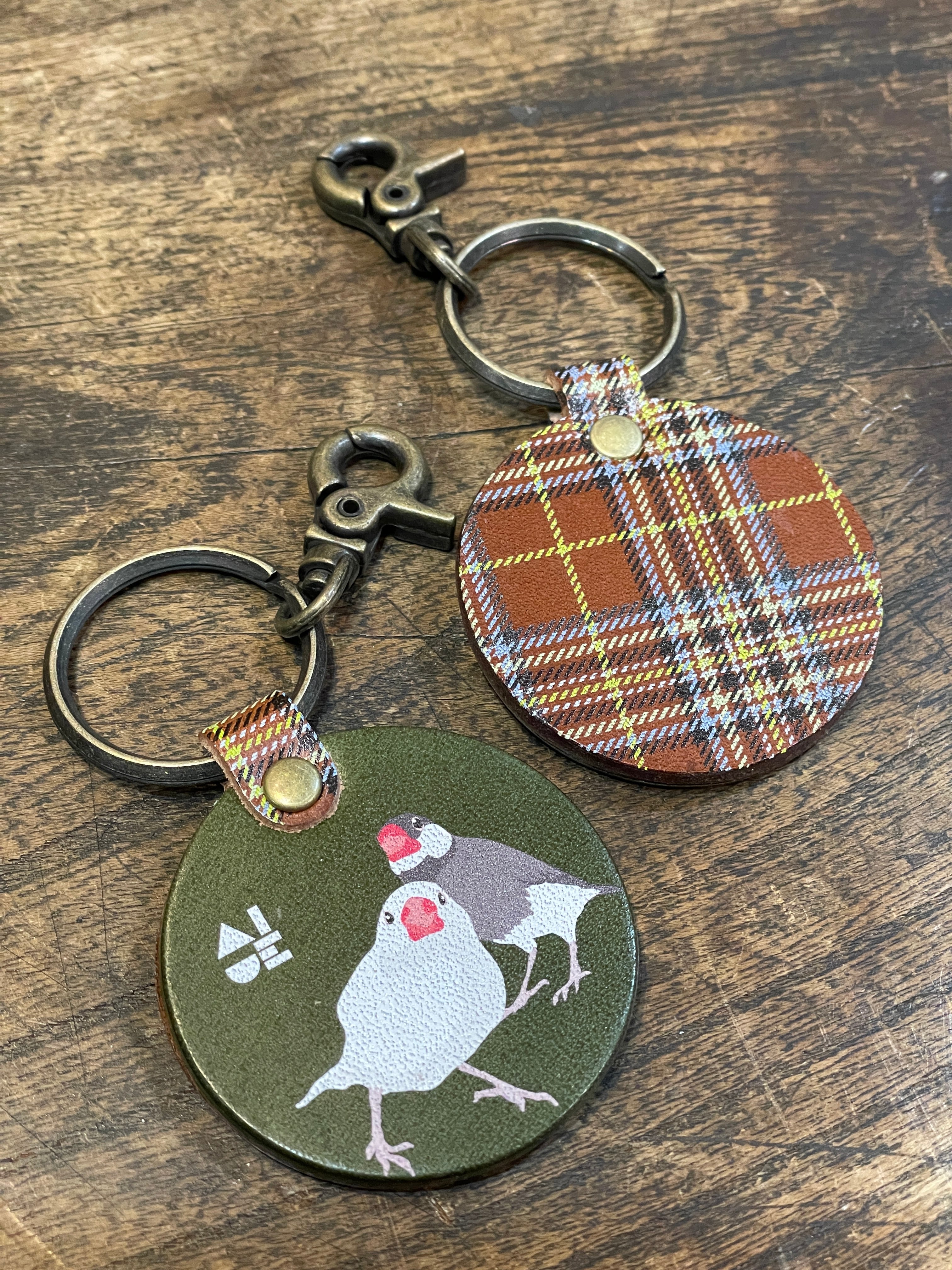 キーホルダー 文鳥 2羽 白文鳥 桜文鳥 Green グリーン ブラウン タータンチェック 栃木レザー 文鳥 ぶんちょう