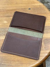 自身の経験を元に、いただいた名刺を一旦入れるためにも重宝するように、広めのポケット以外に3つのポケットをつくりました。シンプルですが機能的なカタチで作りました。