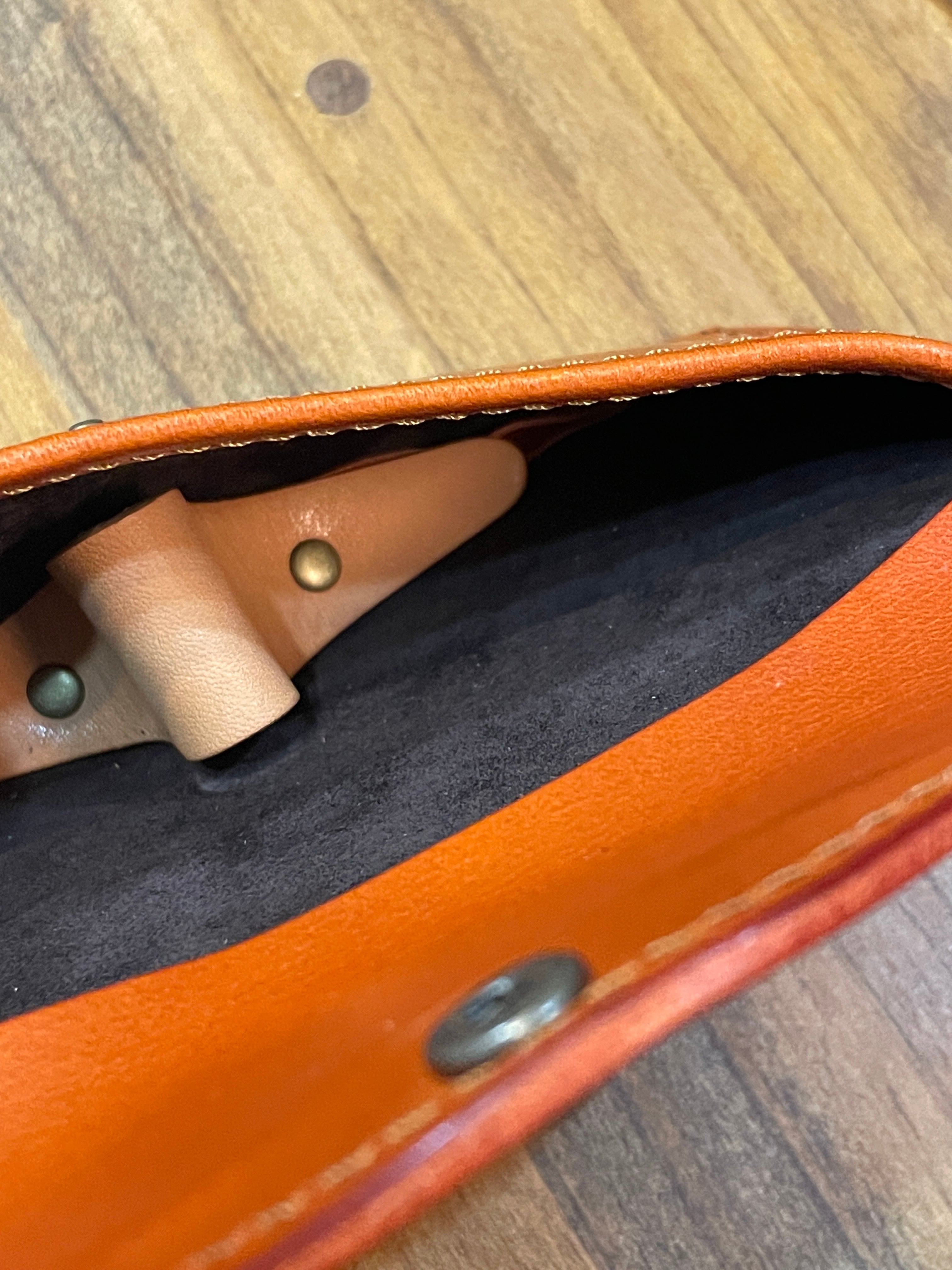 ノースブリッジにはベルトに使用する栃木レザーの中でも分厚く固いシリーズの革を使用し高さをつけることにより、メガネケースのホックを留める時にメガネに圧が干渉しないようにしています。