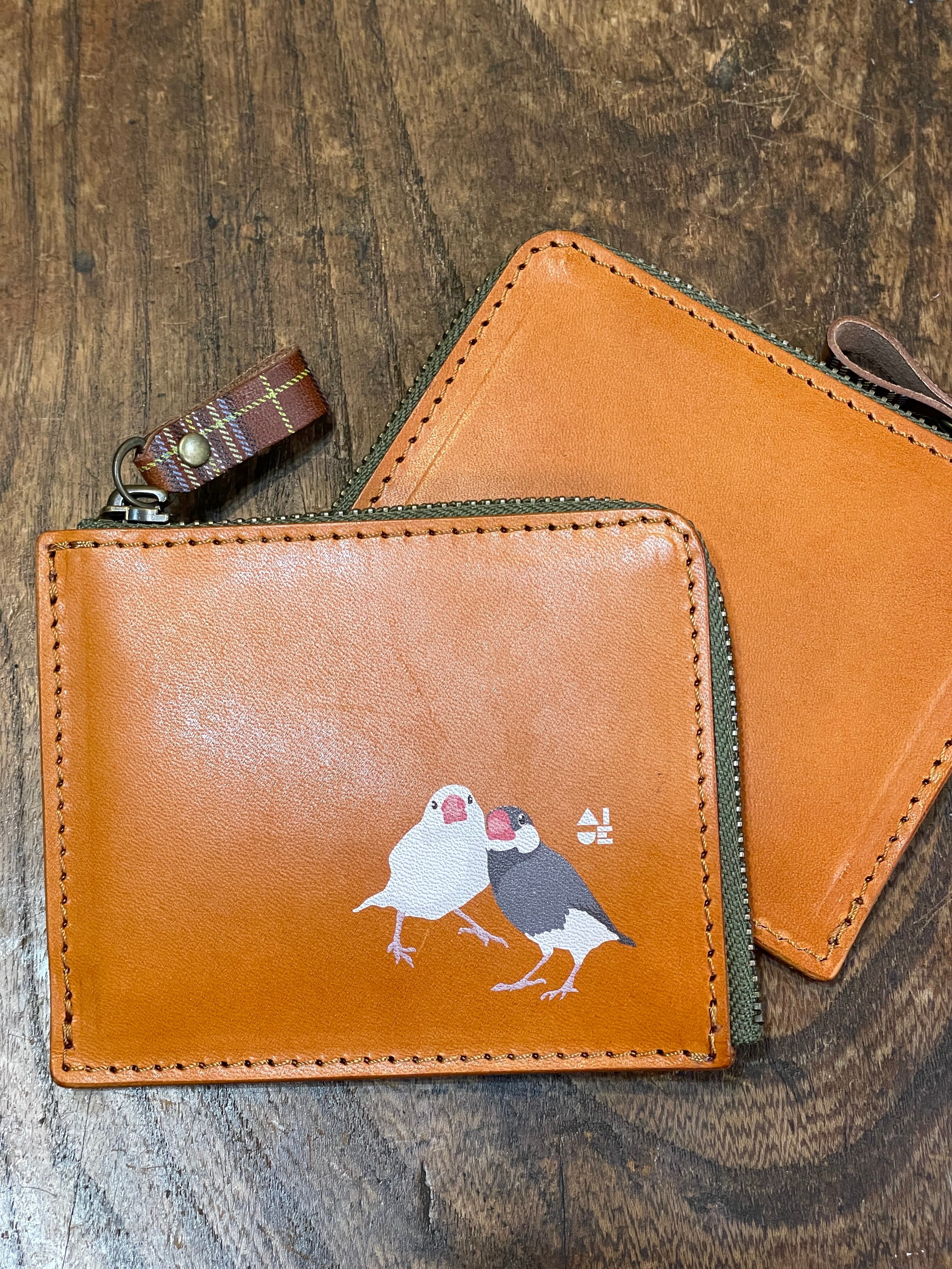 【送料無料】 L字ファスナー財布 文鳥 2羽 キャメル 桜文鳥 白文鳥 財布