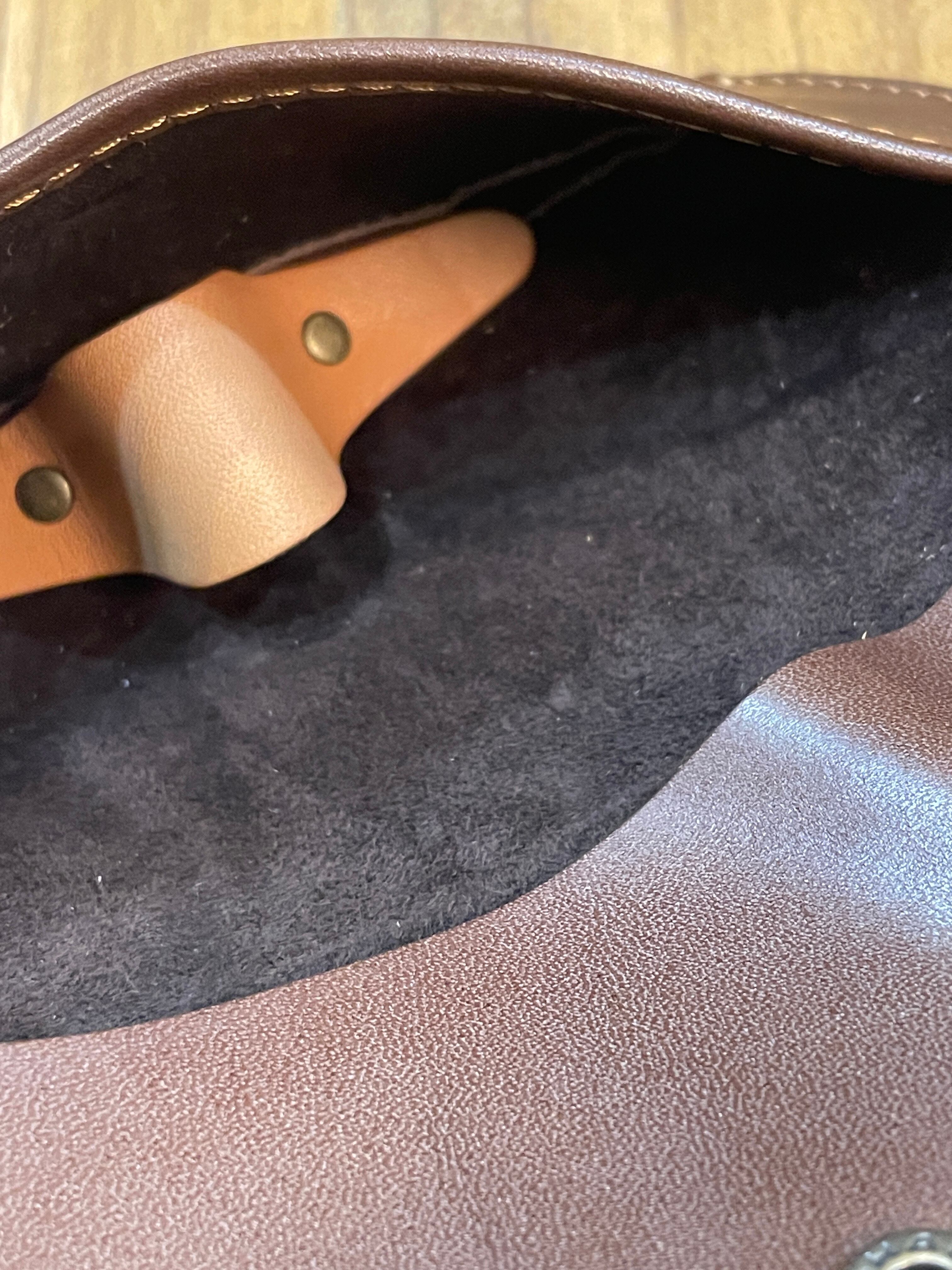 ノースブリッジにはベルトに使用する栃木レザーの中でも分厚く固いシリーズの革を使用し高さをつけることにより、メガネケースのホックを留める時にメガネに圧が干渉しないようにしています。