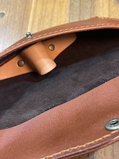 ノーズブリッジにはベルトに使用する栃木レザーの中でも分厚く固いシリーズの革を使用し高さをつけることにより、メガネケースのホックを留める時にメガネに圧が干渉しないようにしています。