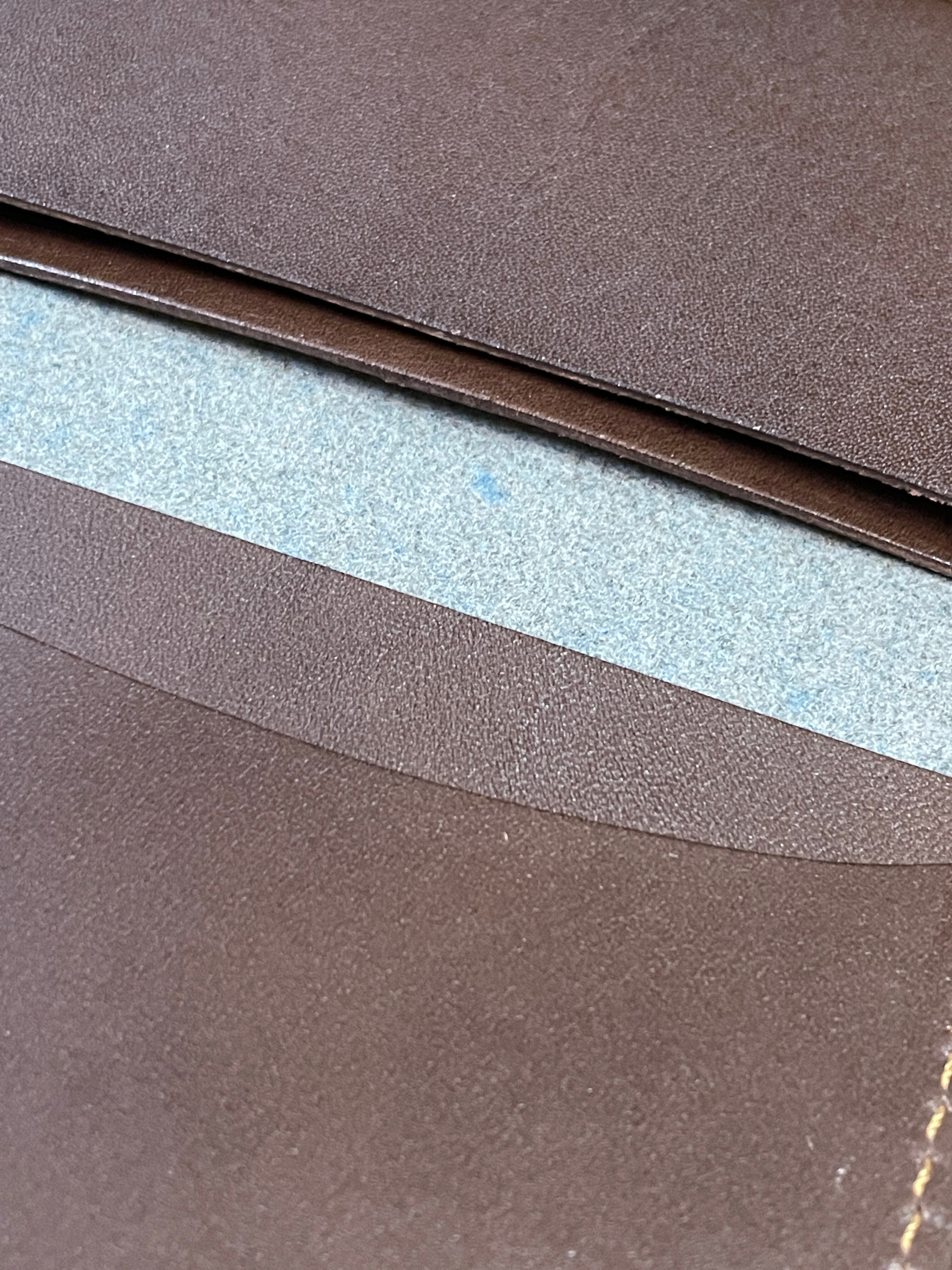 自身の経験を元に、いただいた名刺を一旦入れるためにも重宝するように、広めのポケット以外に3つのポケットをつくりました。シンプルですが機能的なカタチで作りました。