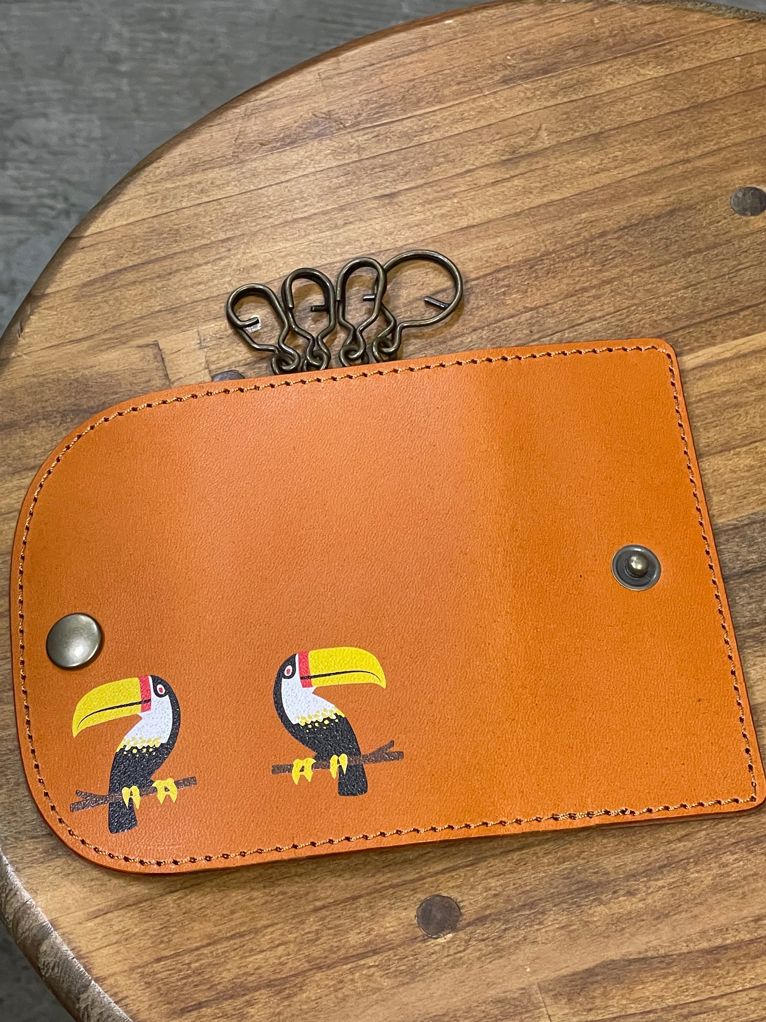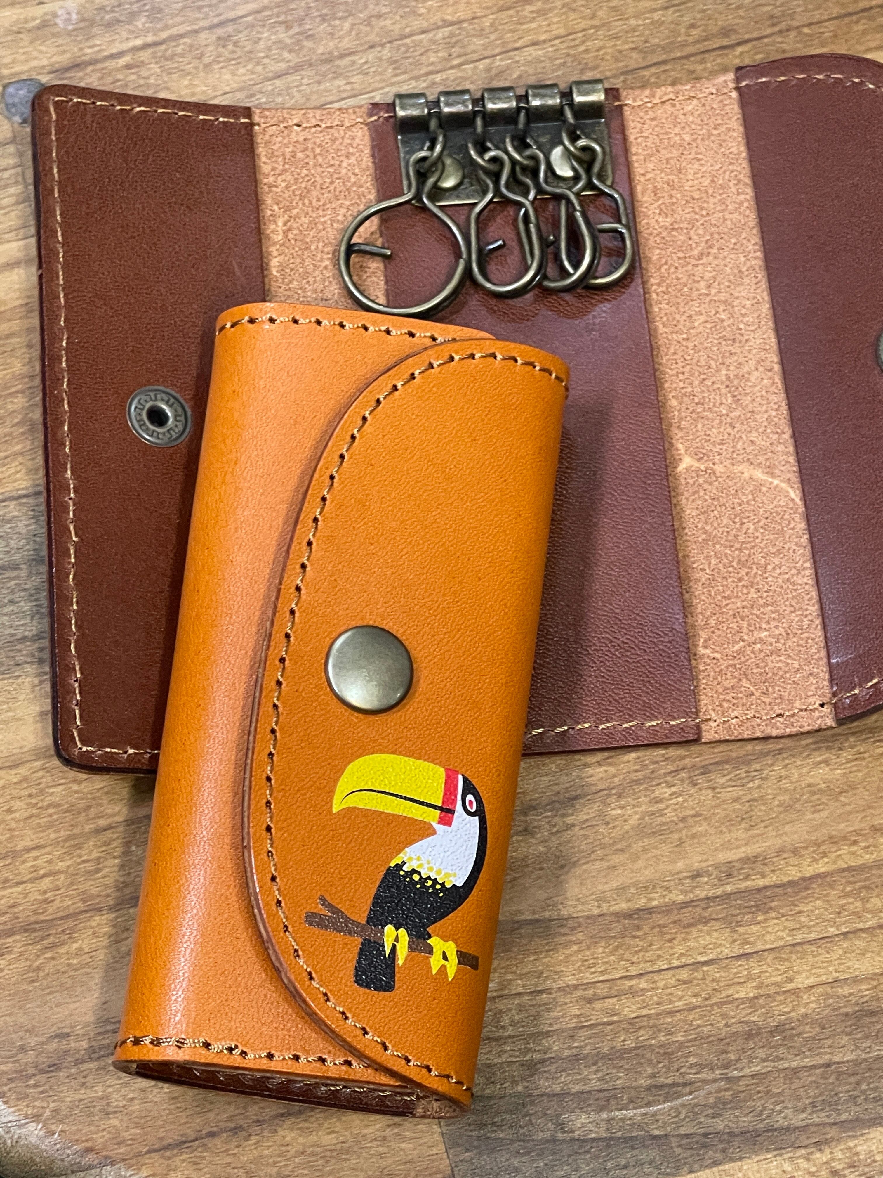 もっともオーソドックスな形、鍵を付ける金具は4連の壊れにくくて着脱が容易なGリングを採用しました。また日常使いのアイテムですので、できるだけ軽くそして強度はしっかりの最適な厚みにした革で制作しました。