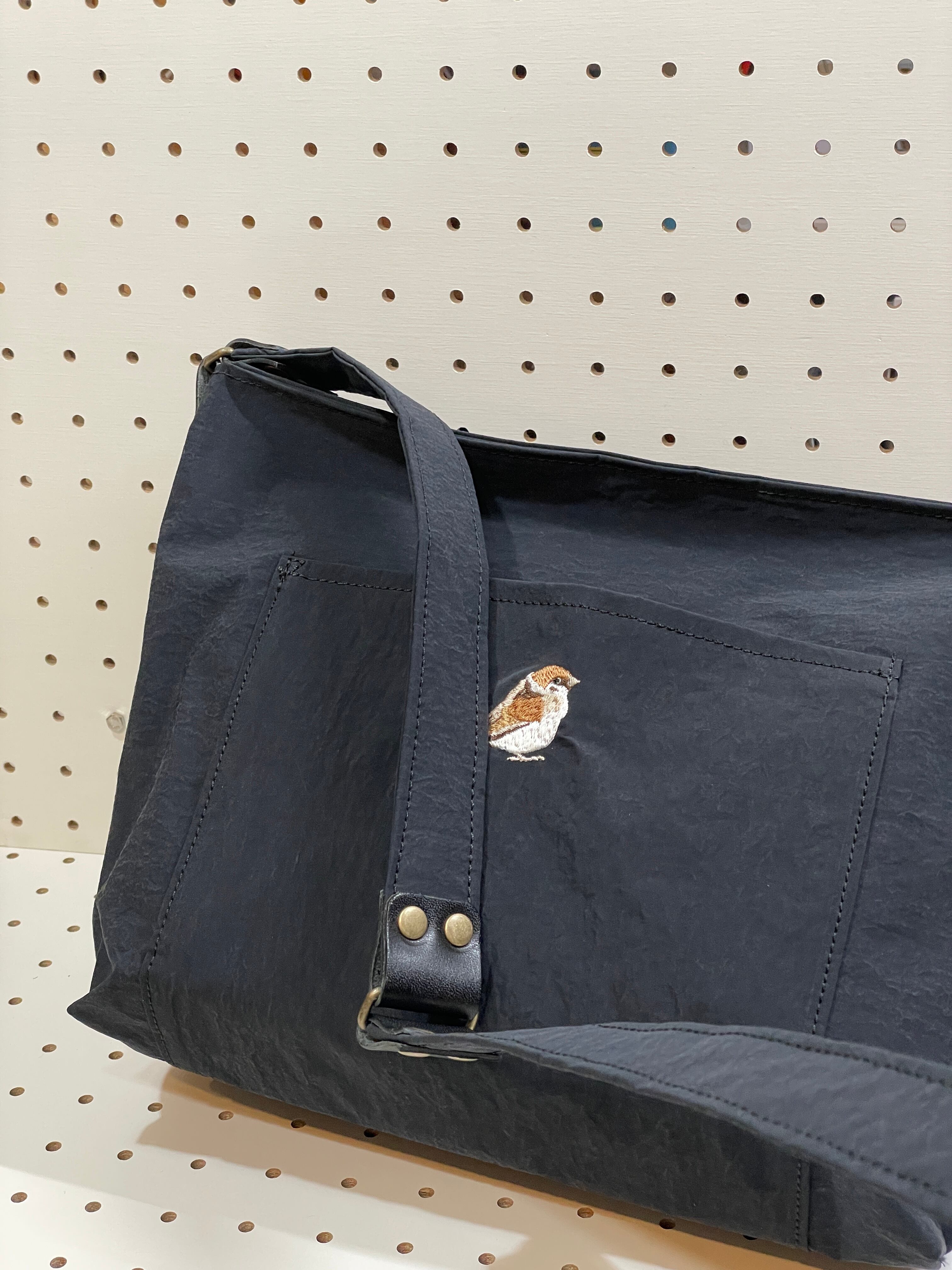 軽くて強くて撥水加工されてて自立するのに手触り最高でお手入れ簡単という、こだわり強めの私が一目惚れした小松マテーレさんが開発したKONBUという名前の新素材生地でつくったショルダーバッグです。