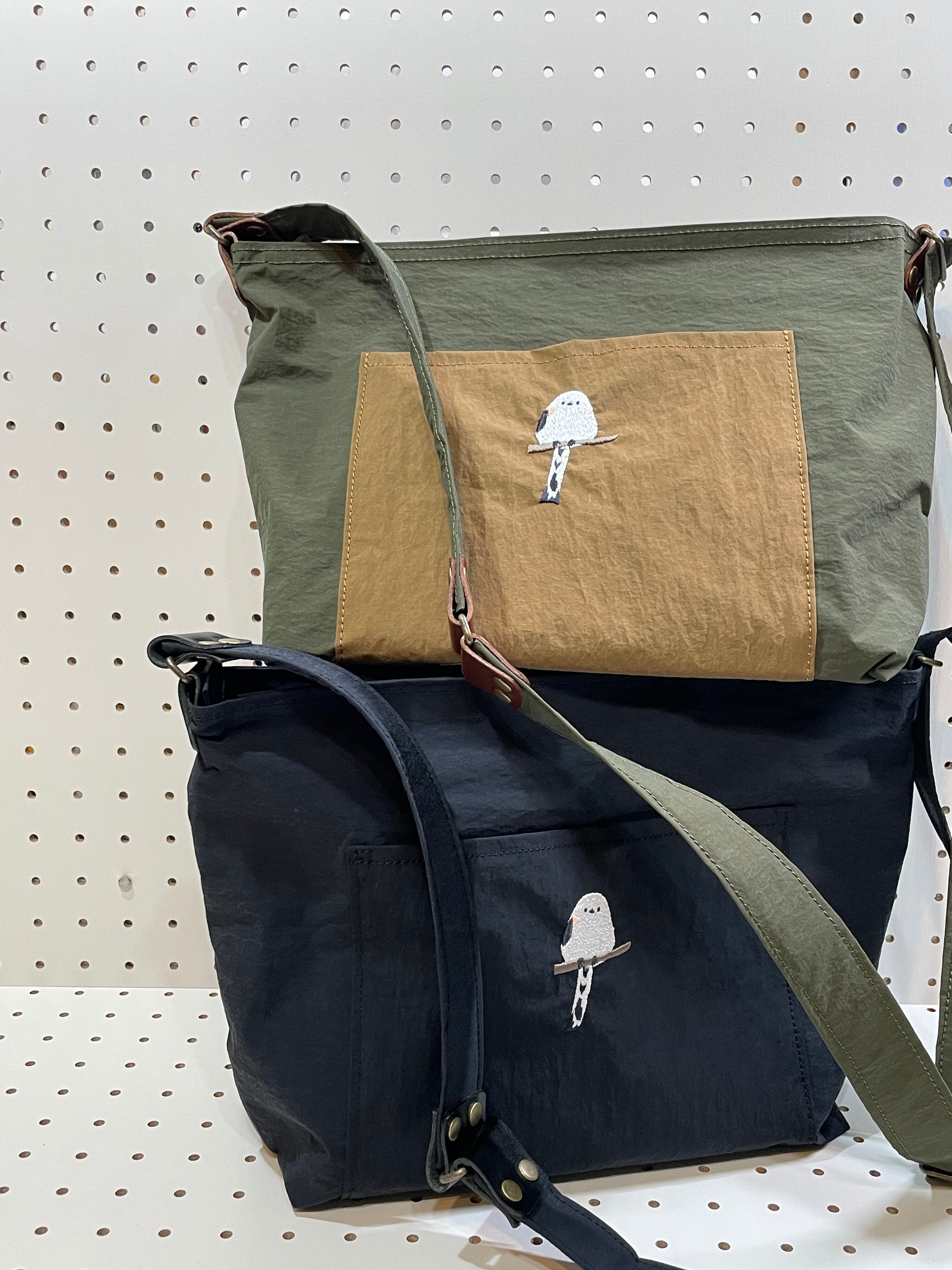 軽くて強くて撥水加工されてて自立するのに手触り最高でお手入れ簡単という、こだわり強めの私が一目惚れした小松マテーレさんが開発したKONBUという名前の新素材生地でつくったショルダーバッグです。