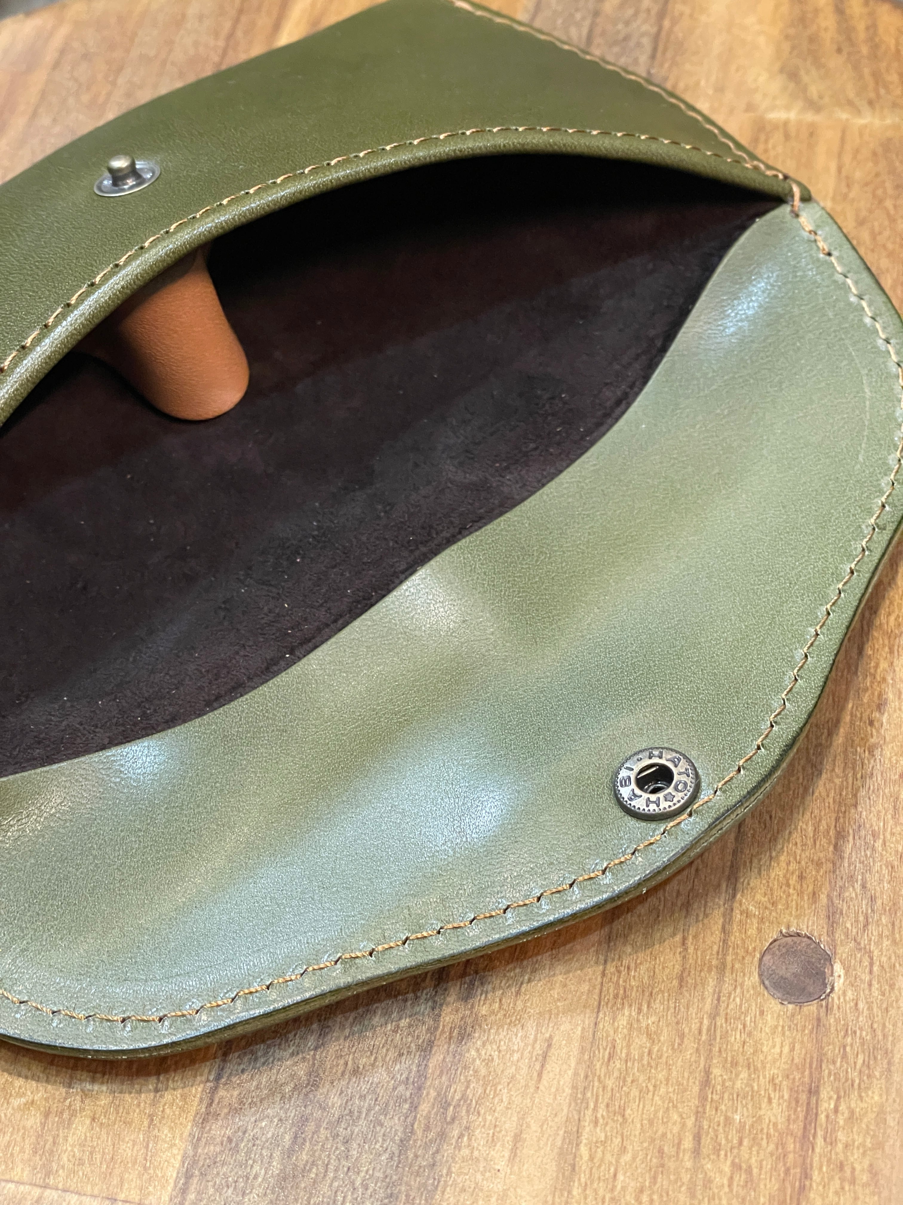ノースブリッジにはベルトに使用する栃木レザーの中でも分厚く固いシリーズの革を使用し高さをつけることにより、メガネケースのホックを留める時にメガネに圧が干渉しないようにしています。