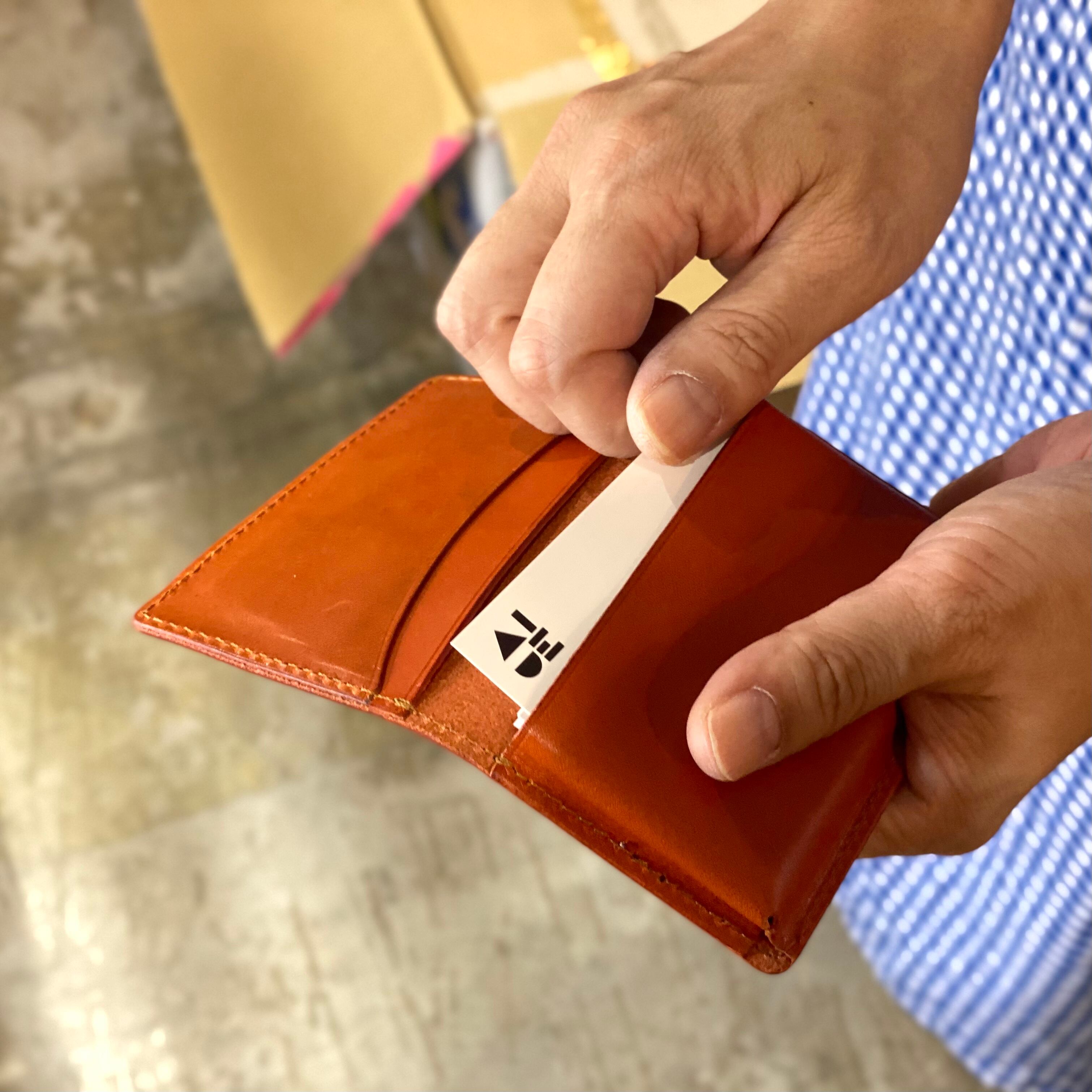 自身の経験を元に、いただいた名刺を一旦入れるためにも重宝するように、広めのポケット以外に3つのポケットをつくりました。シンプルですが機能的なカタチで作りました。
