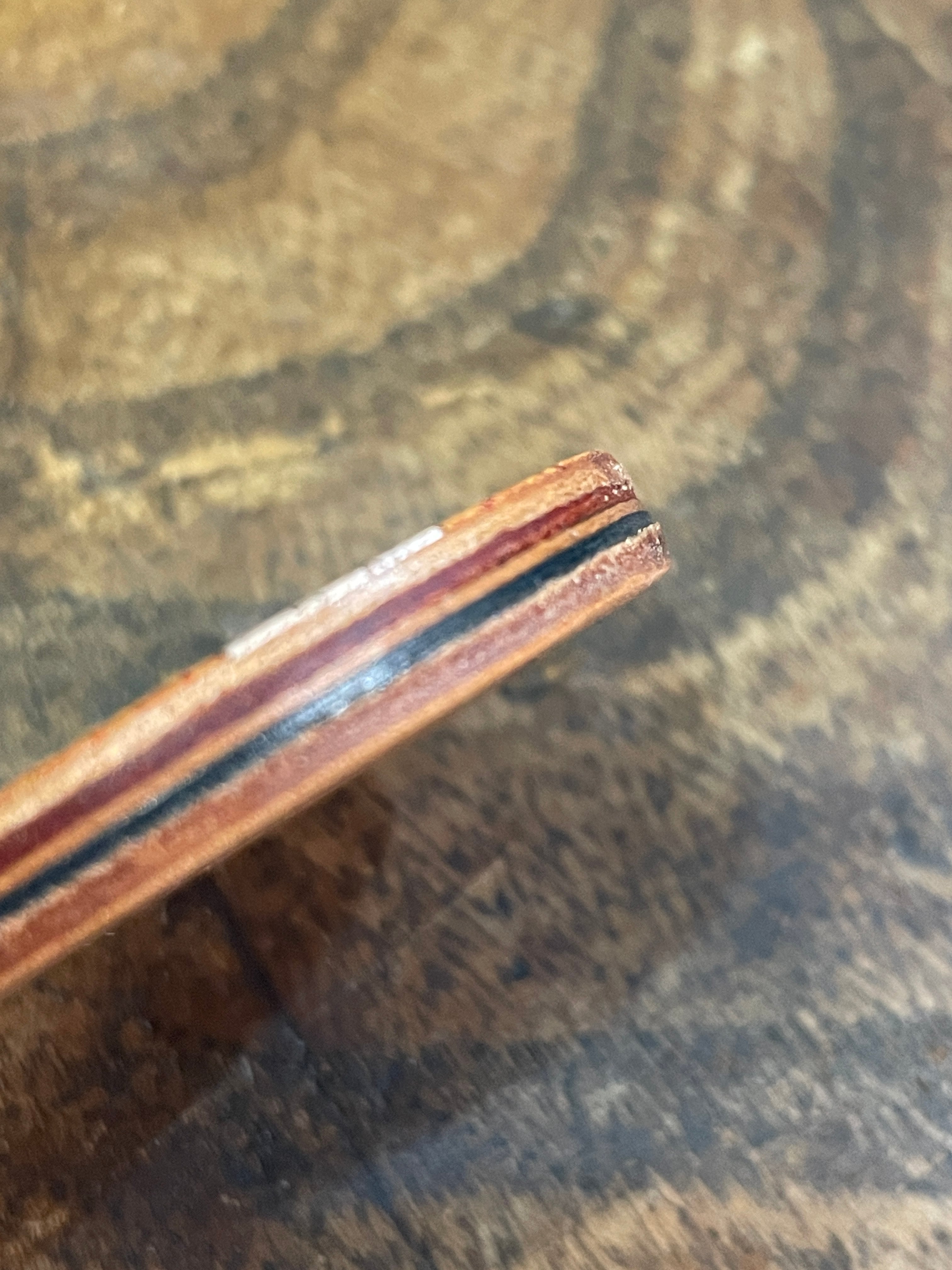 おせんべいの束感を出したくて、横から見た時にも煎餅が重なっているように、5枚の革を重ね合わせています。