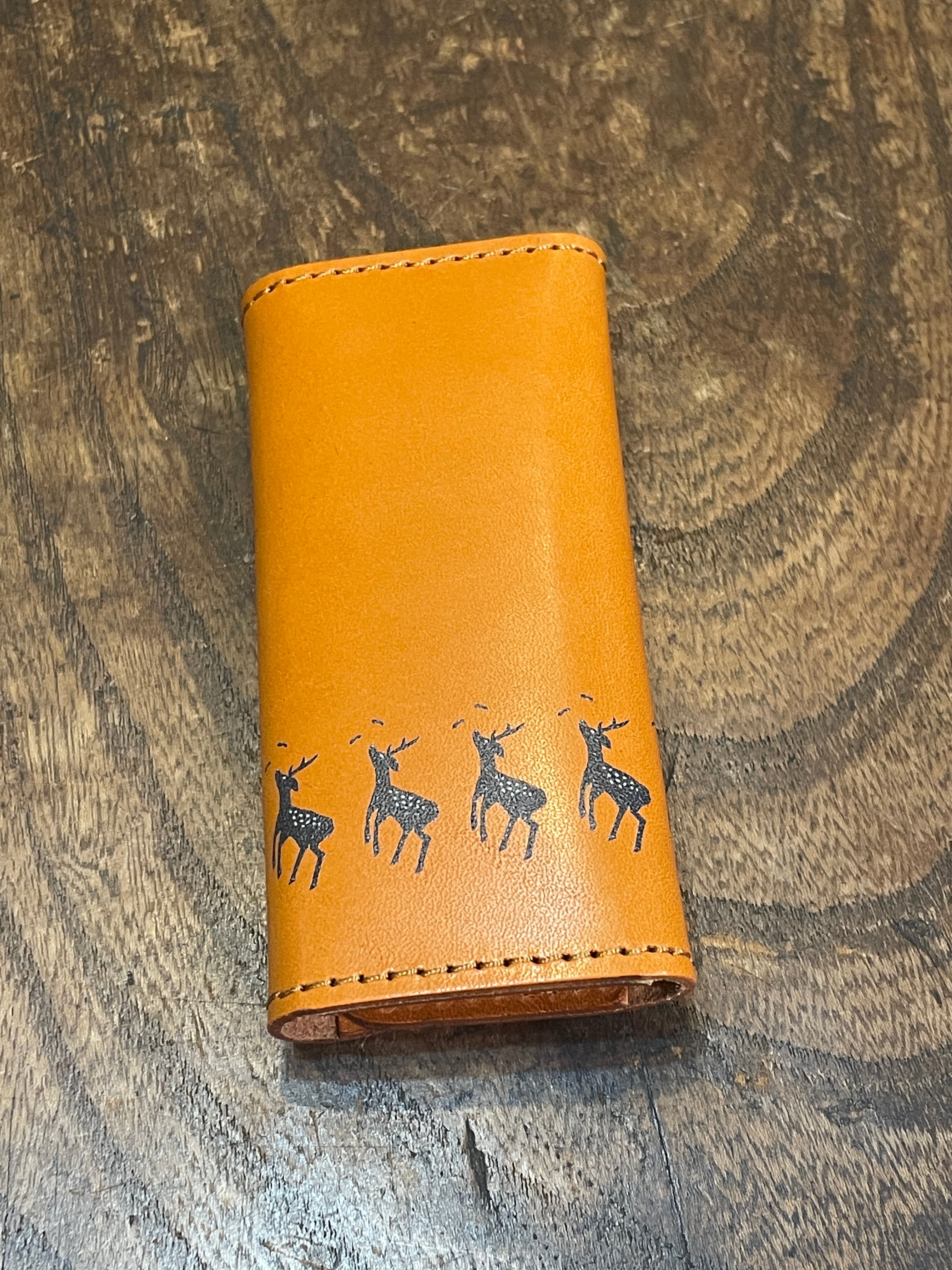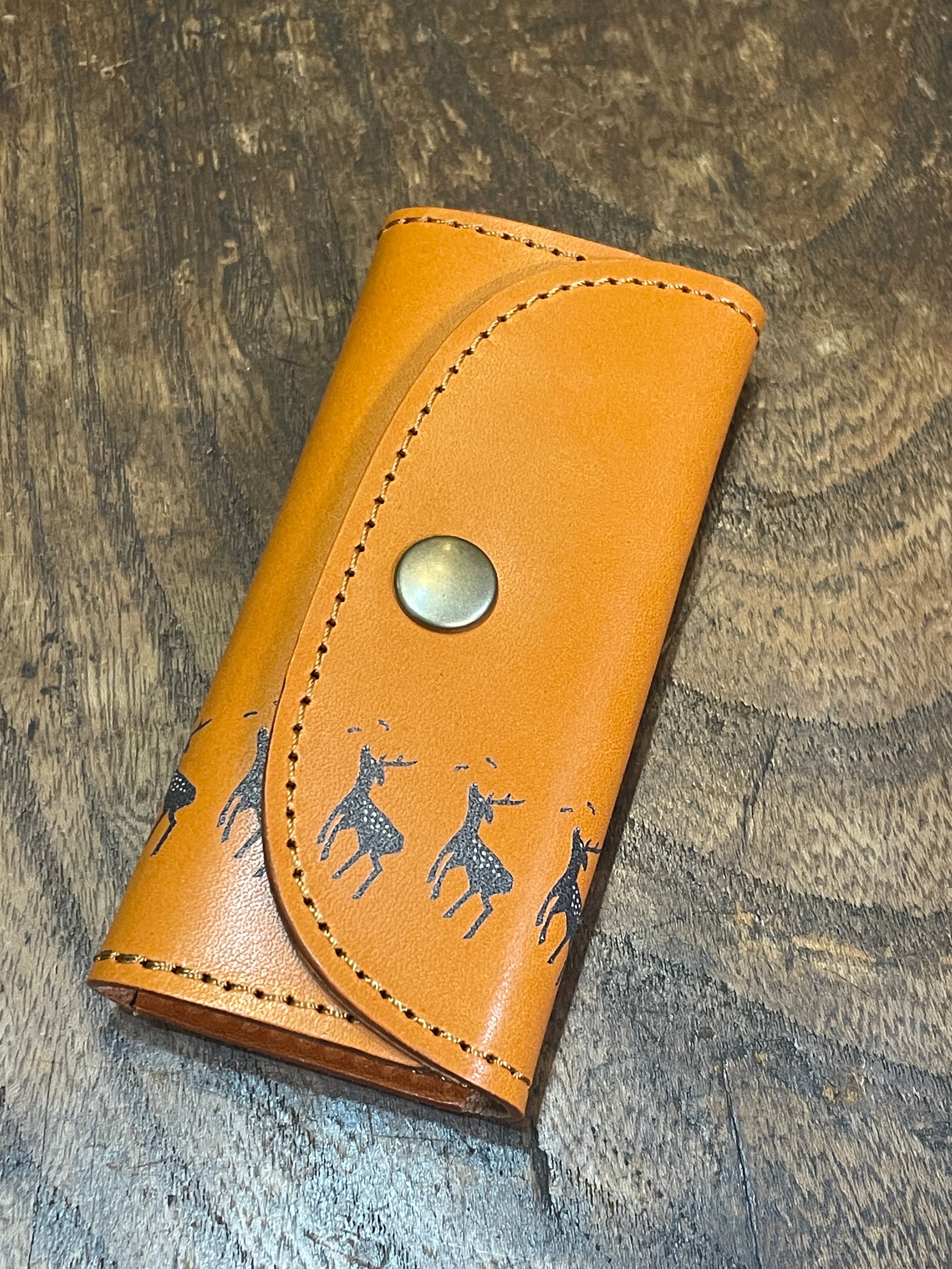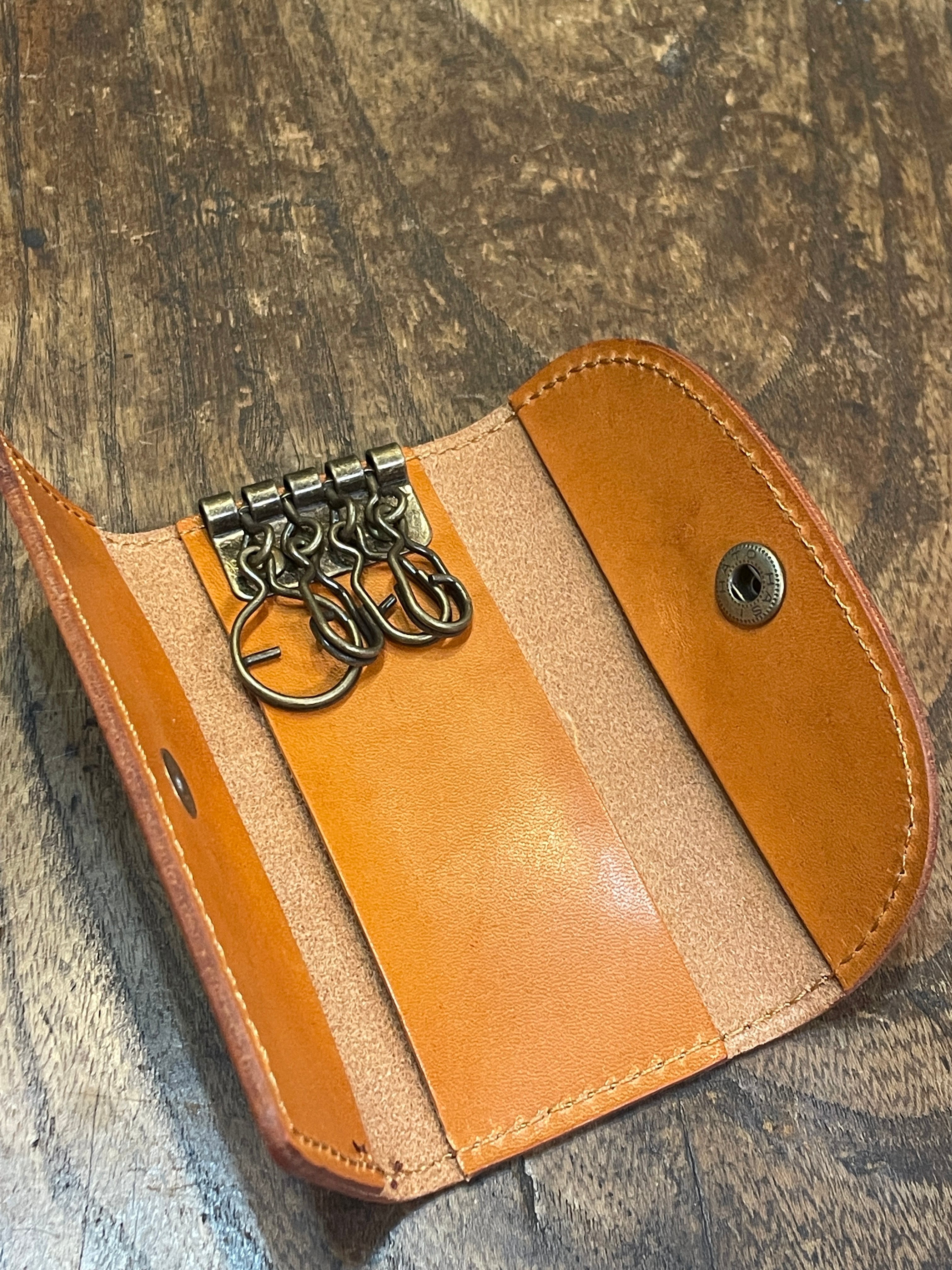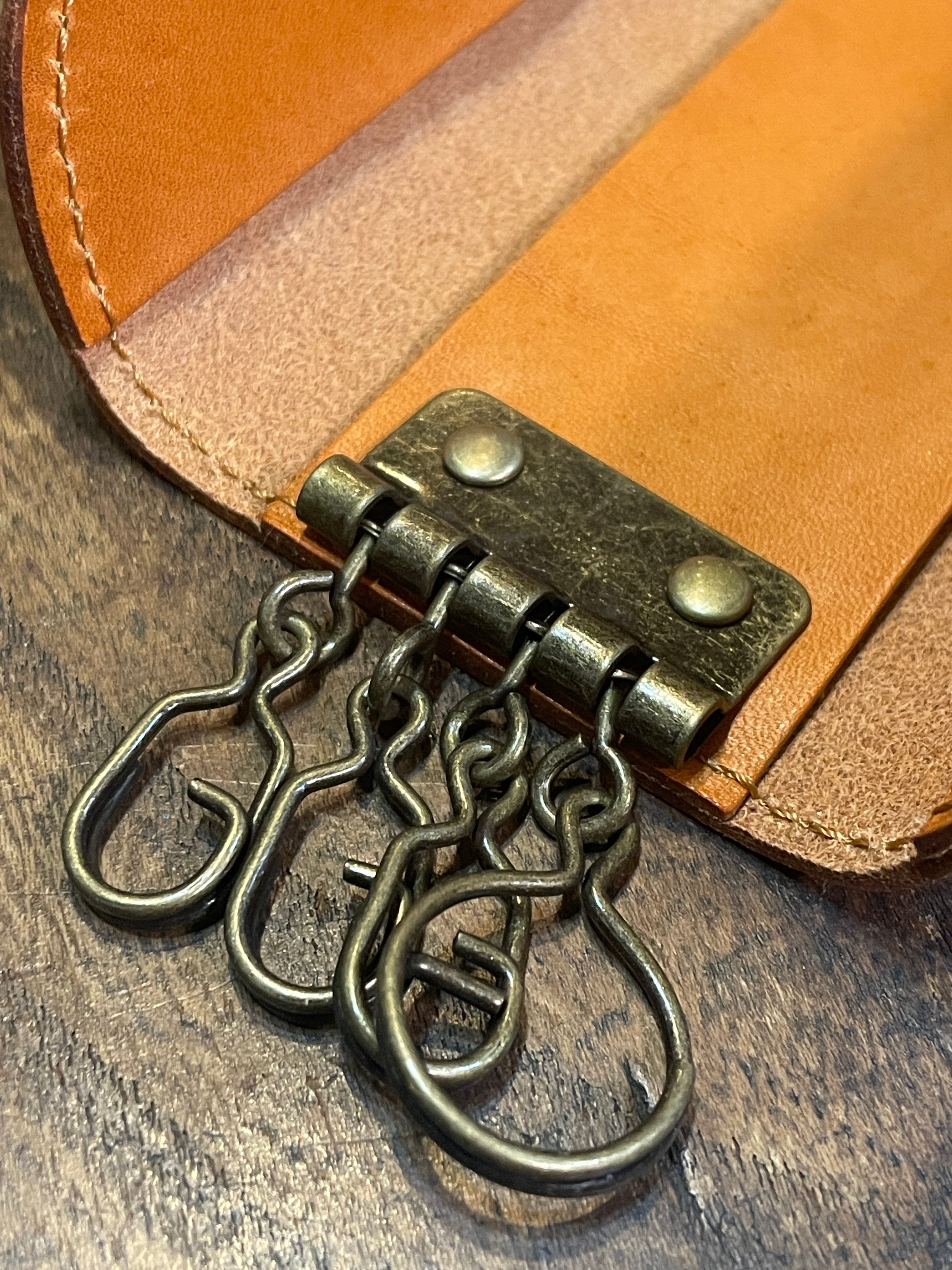 もっともオーソドックスな形、鍵を付ける金具は4連の壊れにくくて着脱が容易なGリングを採用しました。また日常使いのアイテムですので、できるだけ軽くそして強度はしっかりの最適な厚みにした革で制作しました。