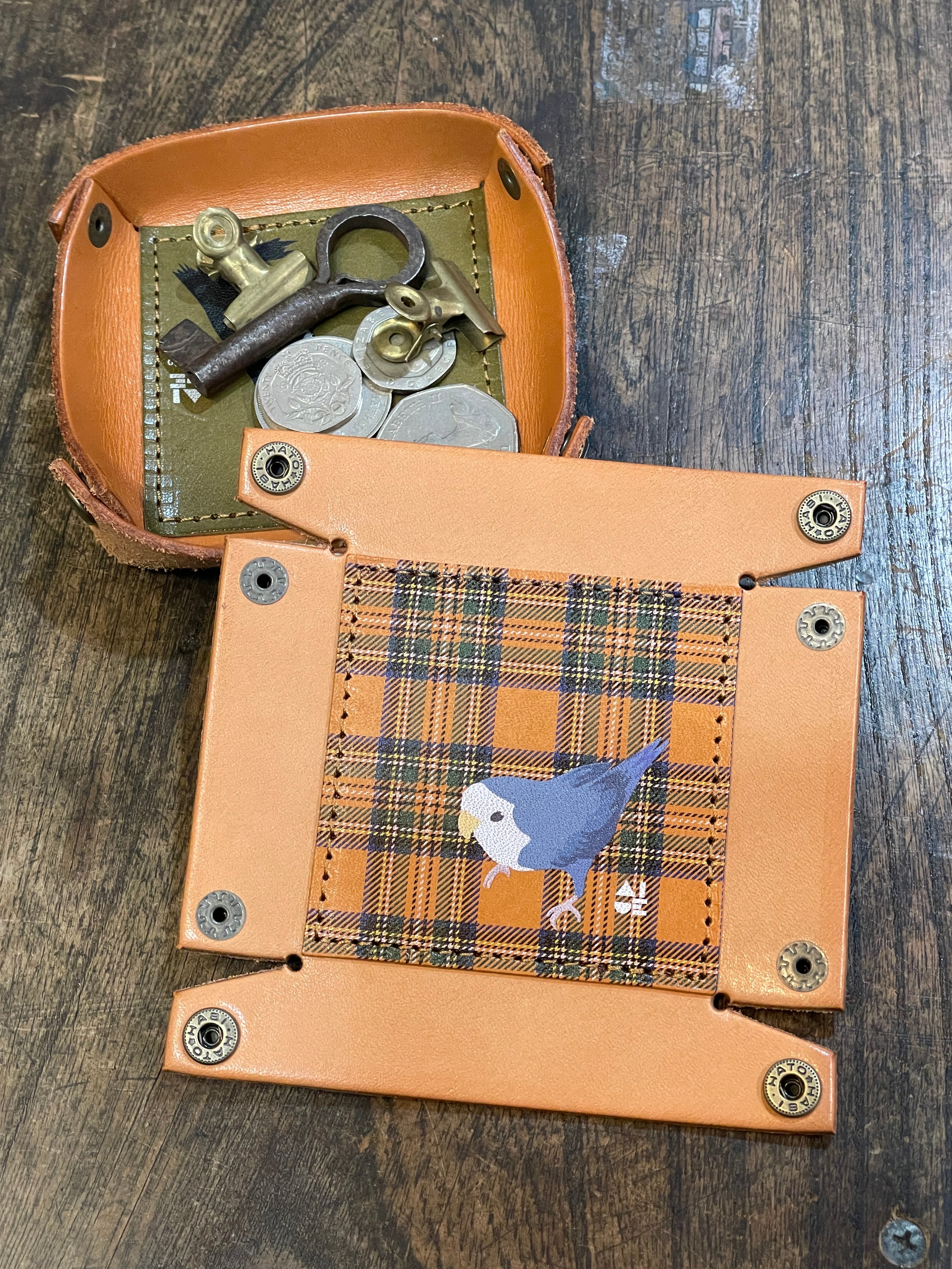 本革、栃木レザーで作った持ち運びにも便利なホック式のレザートレイです。