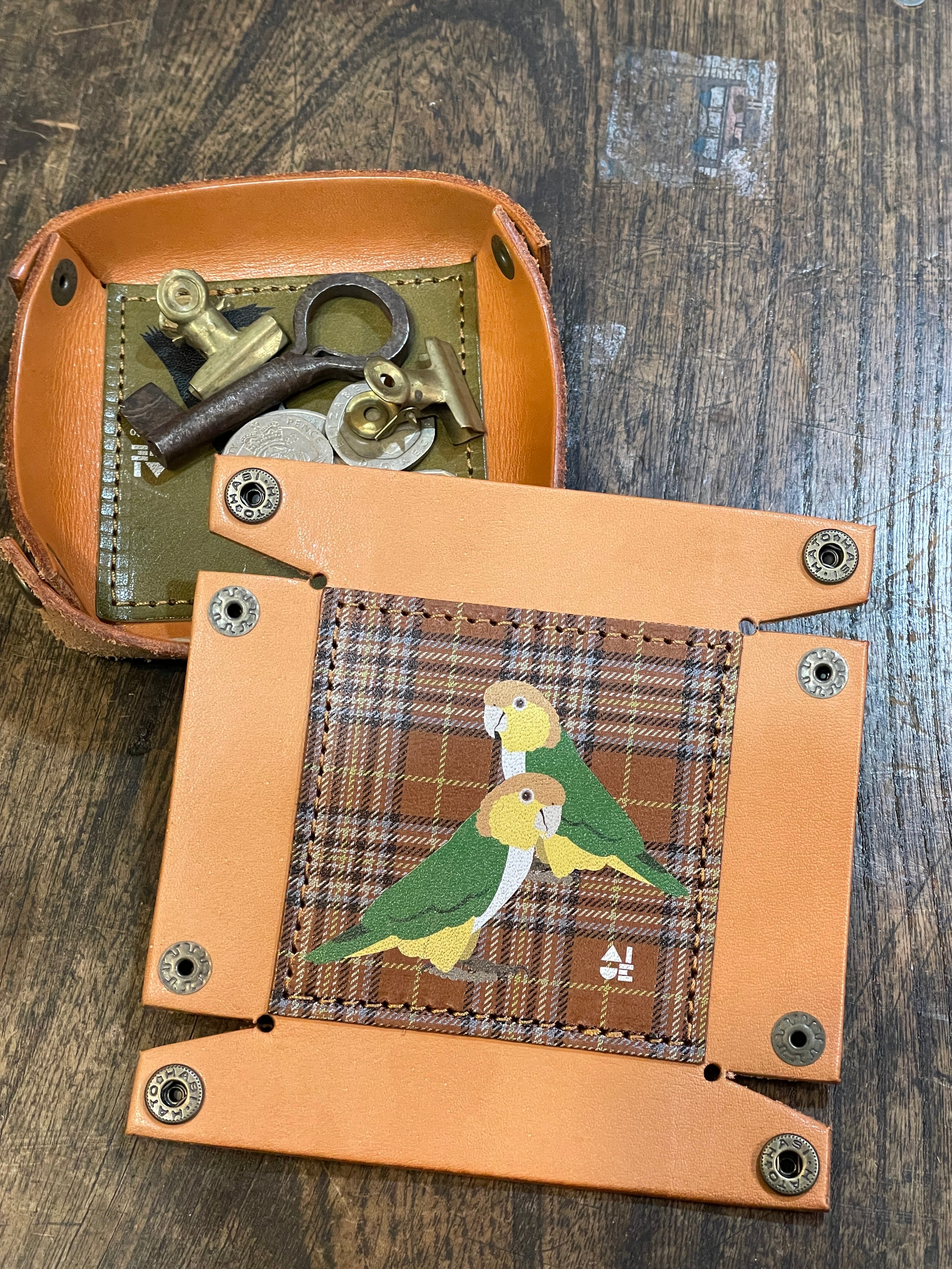 レザートレイ シロハラインコ 2羽 ブラウン タータンチェック 栃木レザー