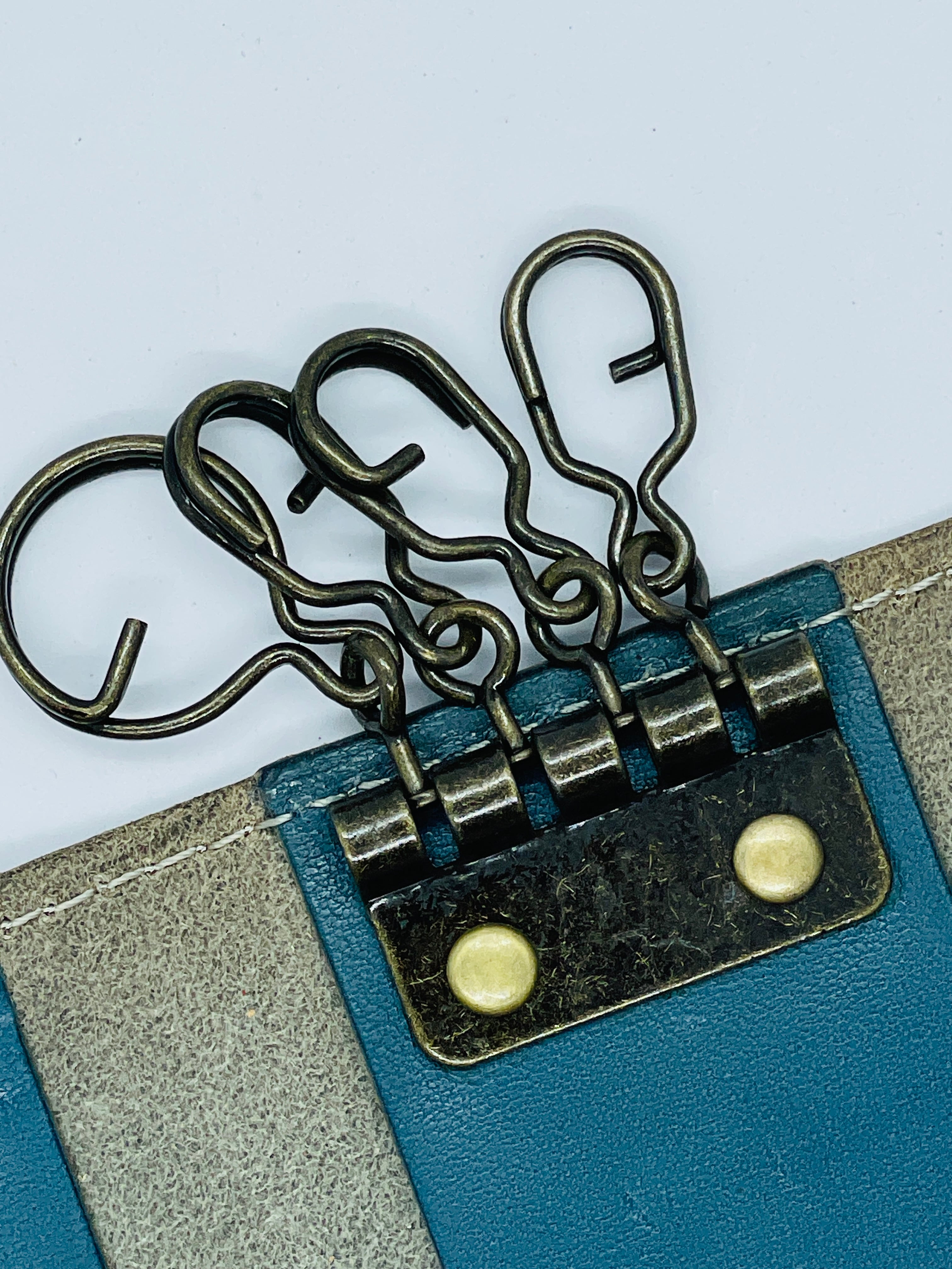 もっともオーソドックスな形、鍵を付ける金具は4連の壊れにくくて着脱が容易なGリングを採用しました。また日常使いのアイテムですので、できるだけ軽くそして強度はしっかりの最適な厚みにした革で制作しました。