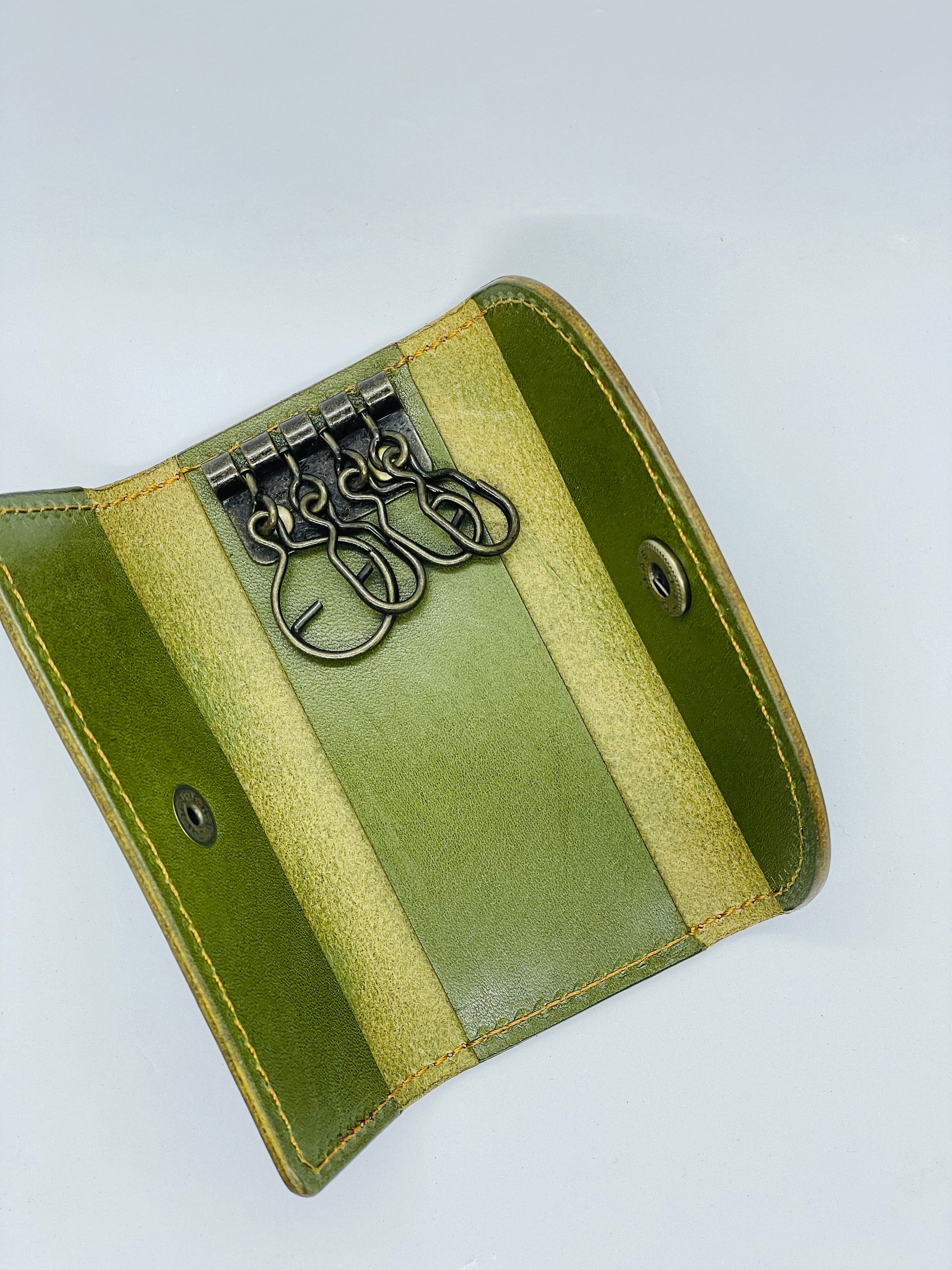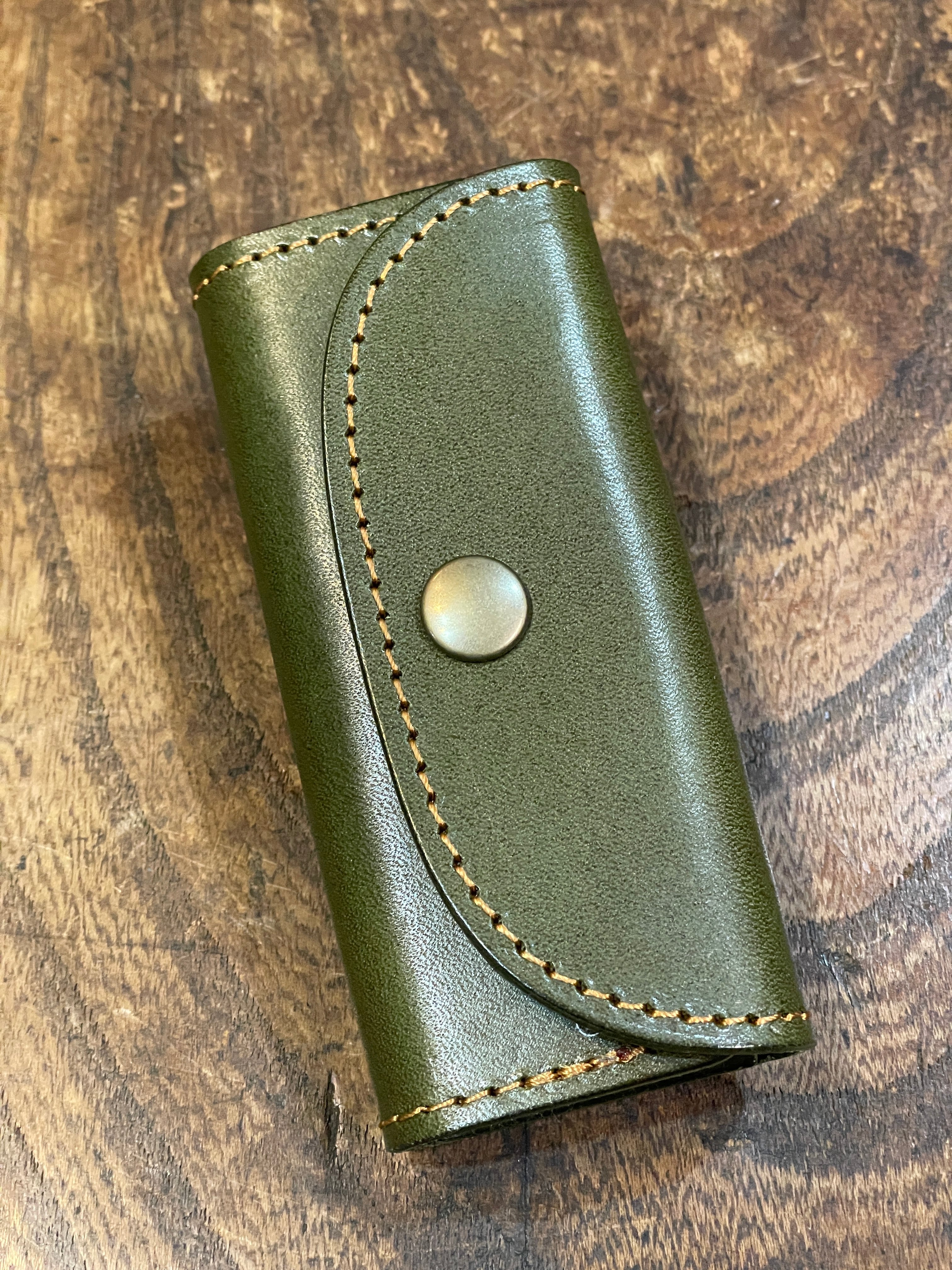 もっともオーソドックスな形、鍵を付ける金具は4連の壊れにくくて着脱が容易なGリングを採用しました。また日常使いのアイテムですので、できるだけ軽くそして強度はしっかりの最適な厚みにした革で制作しました。