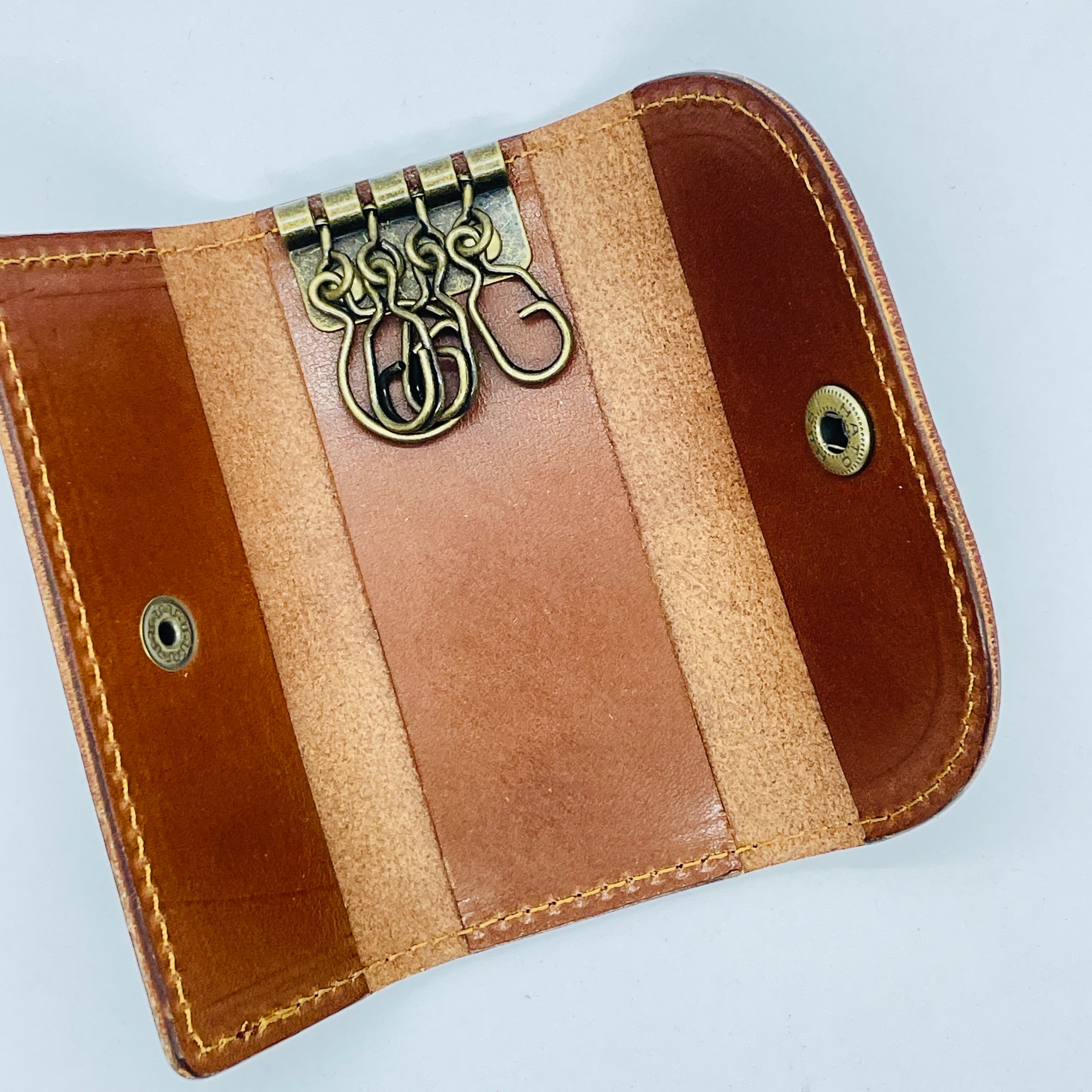 もっともオーソドックスな形、鍵を付ける金具は4連の壊れにくくて着脱が容易なGリングを採用しました。また日常使いのアイテムですので、できるだけ軽くそして強度はしっかりの最適な厚みにした革で制作しました。