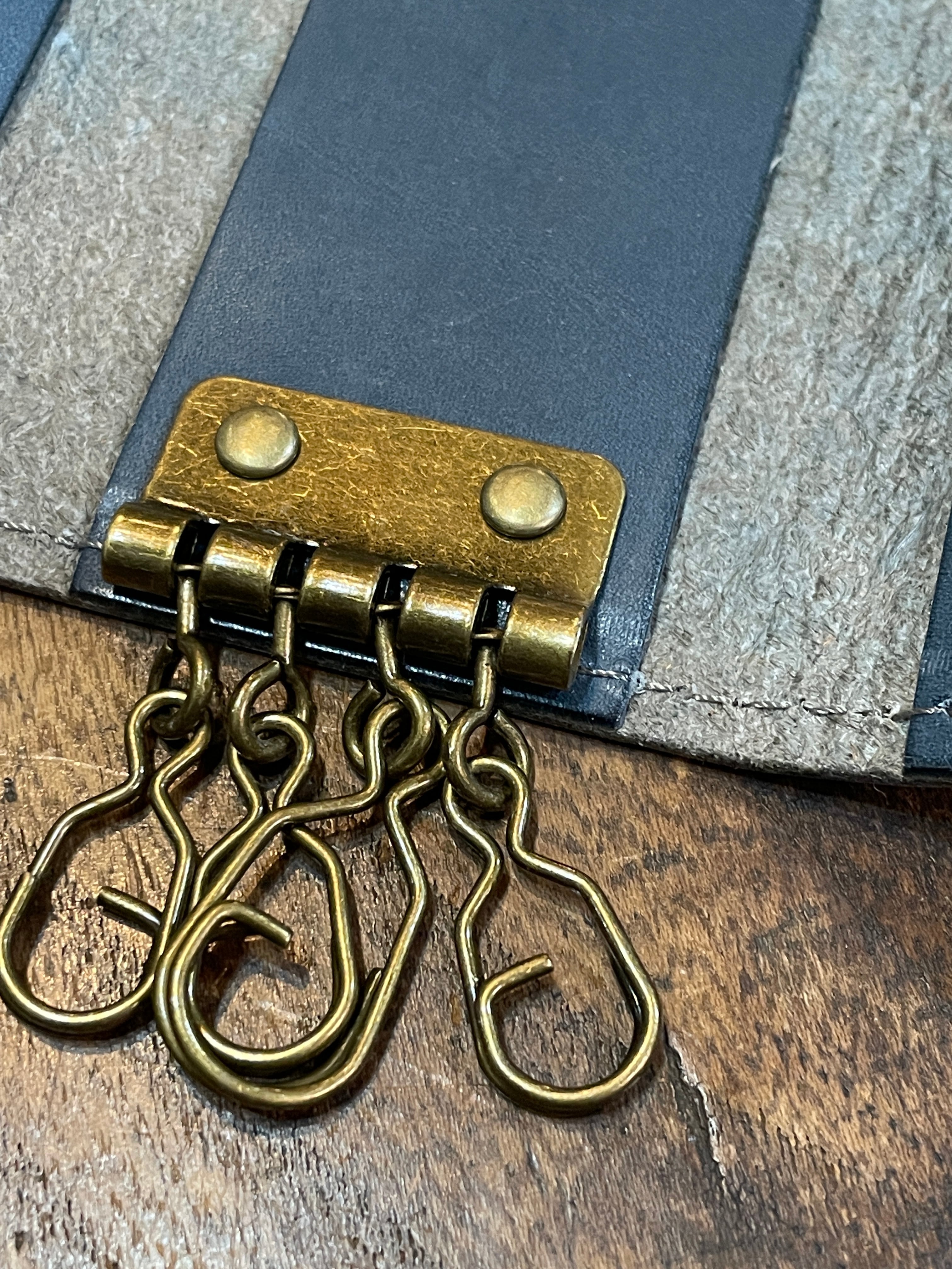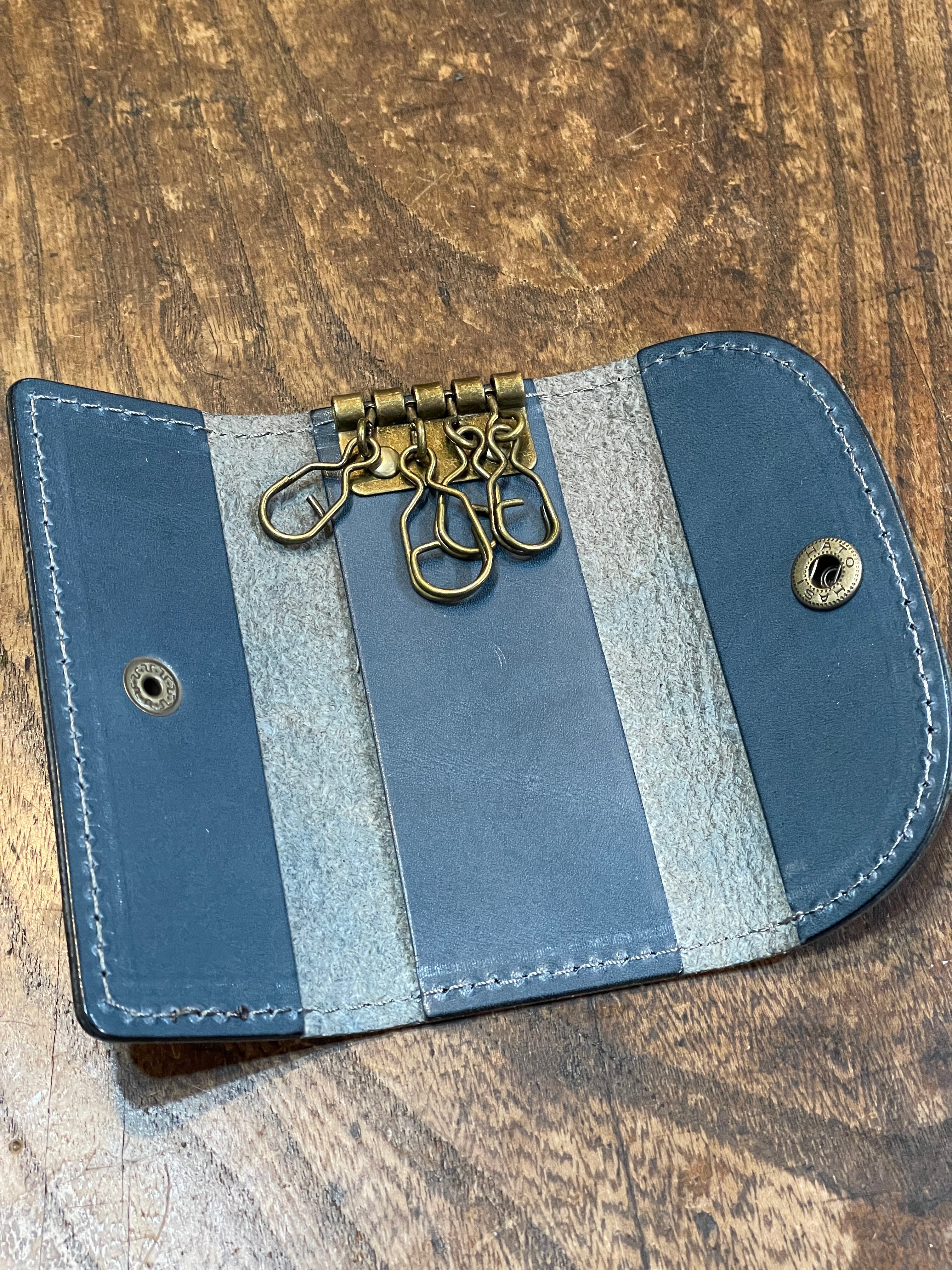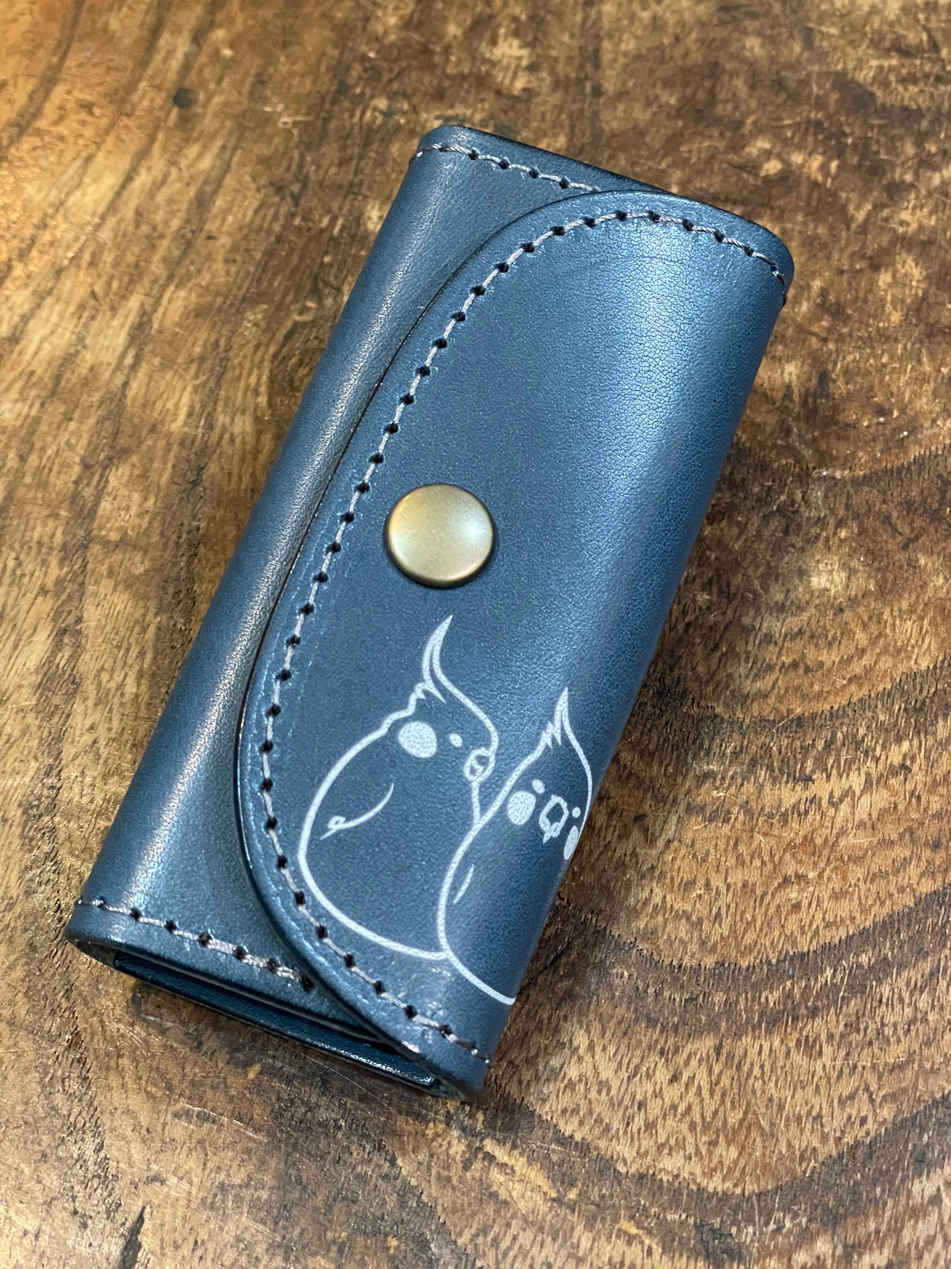 もっともオーソドックスな形、鍵を付ける金具は4連の壊れにくくて着脱が容易なGリングを採用しました。また日常使いのアイテムですので、できるだけ軽くそして強度はしっかりの最適な厚みにした革で制作しました。