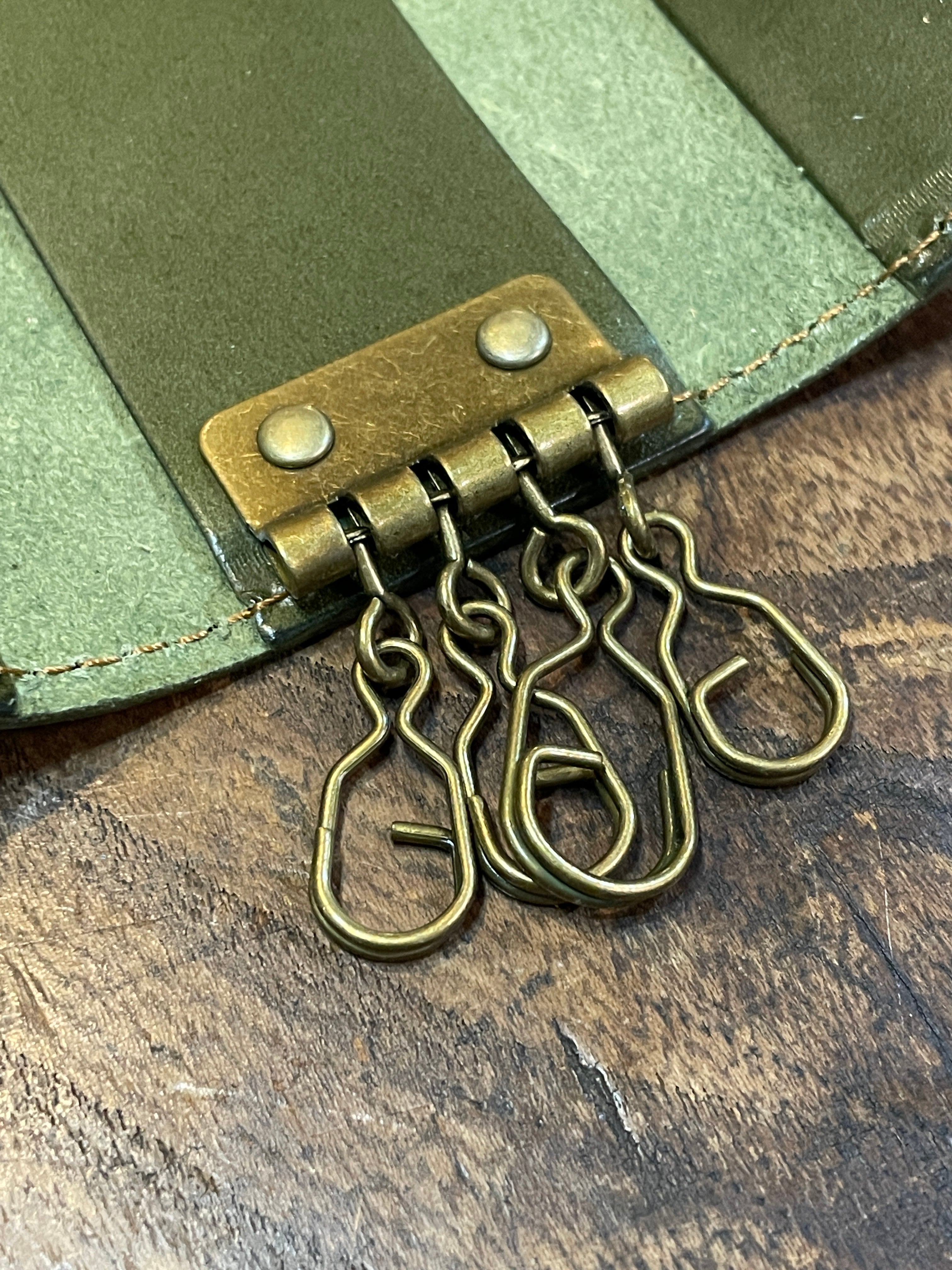 もっともオーソドックスな形、鍵を付ける金具は4連の壊れにくくて着脱が容易なGリングを採用しました。また日常使いのアイテムですので、できるだけ軽くそして強度はしっかりの最適な厚みにした革で制作しました。