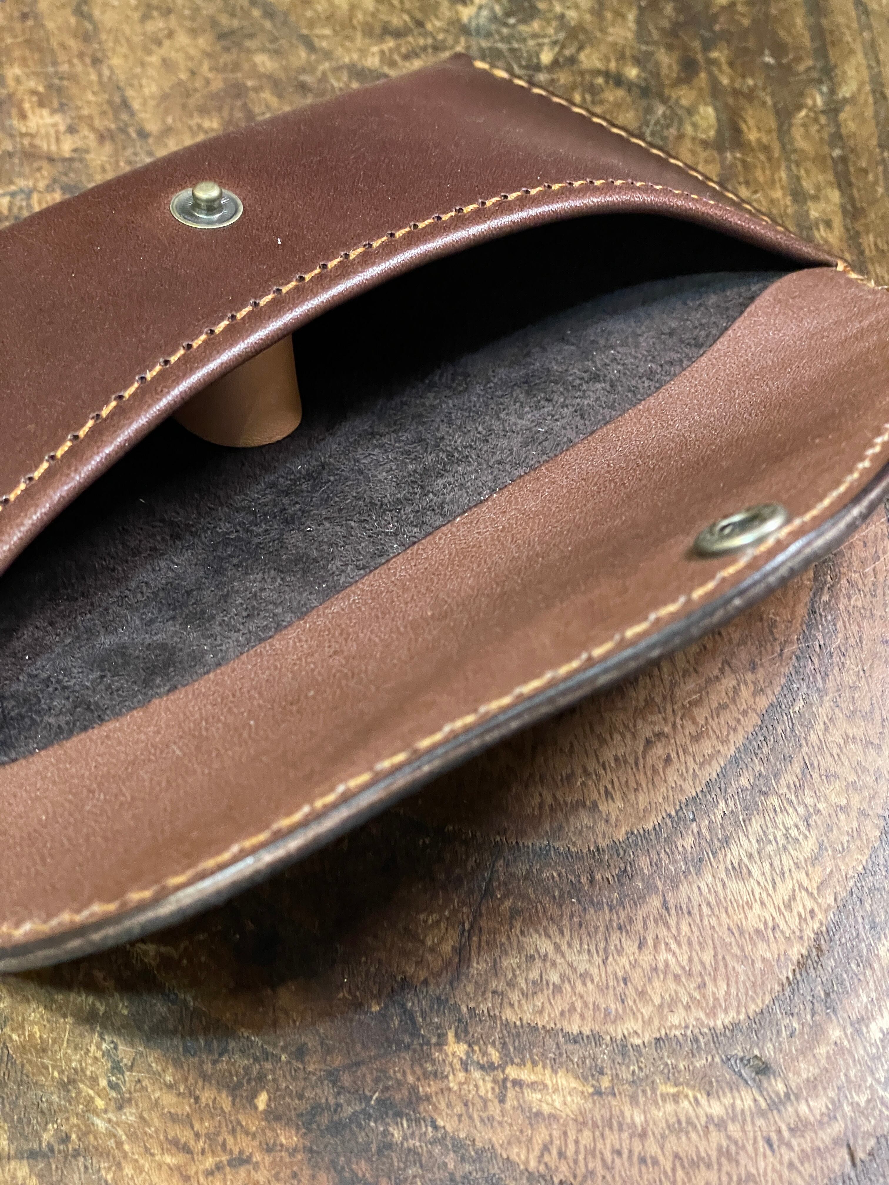 ノースブリッジにはベルトに使用する栃木レザーの中でも分厚く固いシリーズの革を使用し高さをつけることにより、メガネケースのホックを留める時にメガネに圧が干渉しないようにしています。
