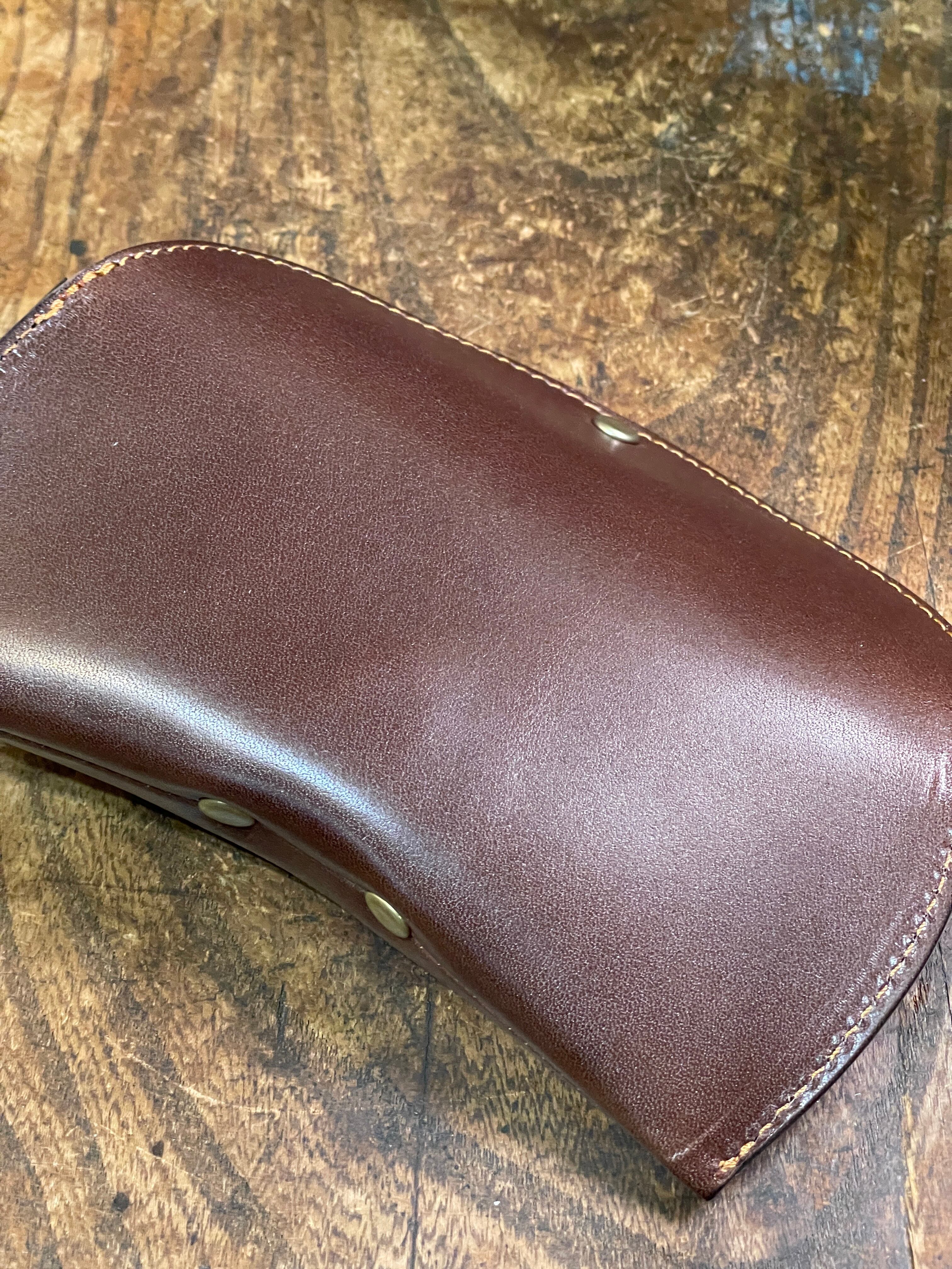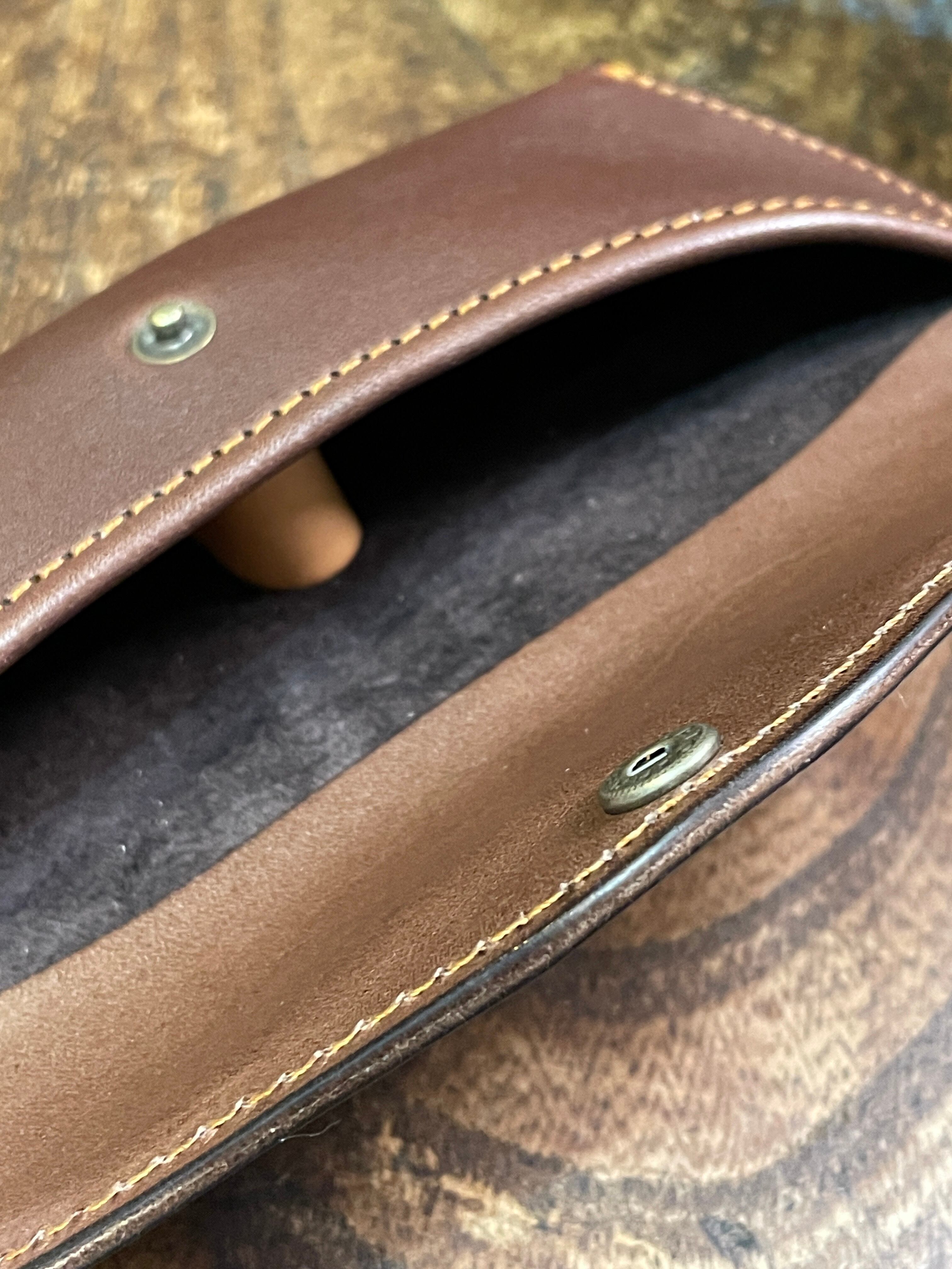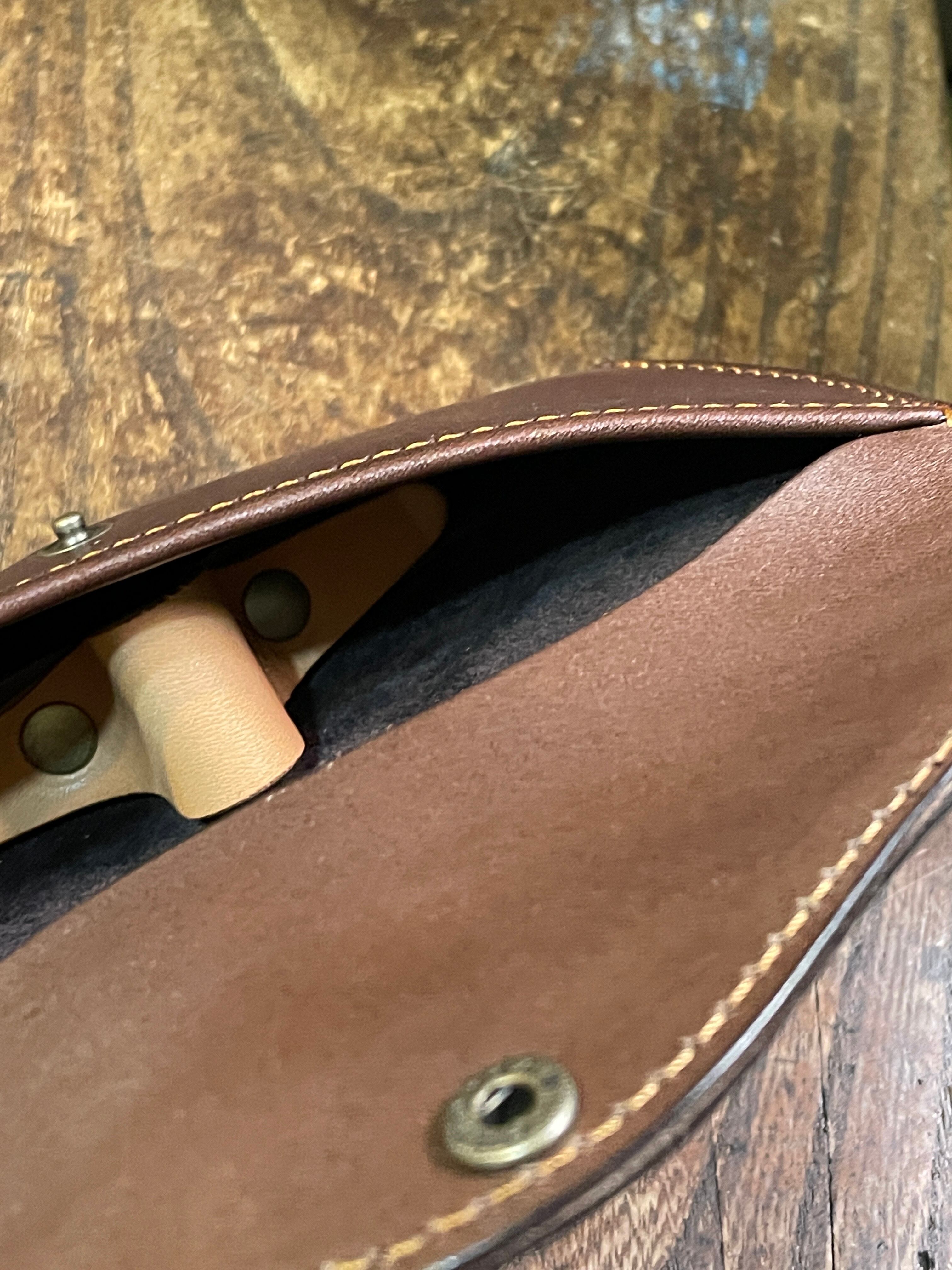 ノースブリッジにはベルトに使用する栃木レザーの中でも分厚く固いシリーズの革を使用し高さをつけることにより、メガネケースのホックを留める時にメガネに圧が干渉しないようにしています。