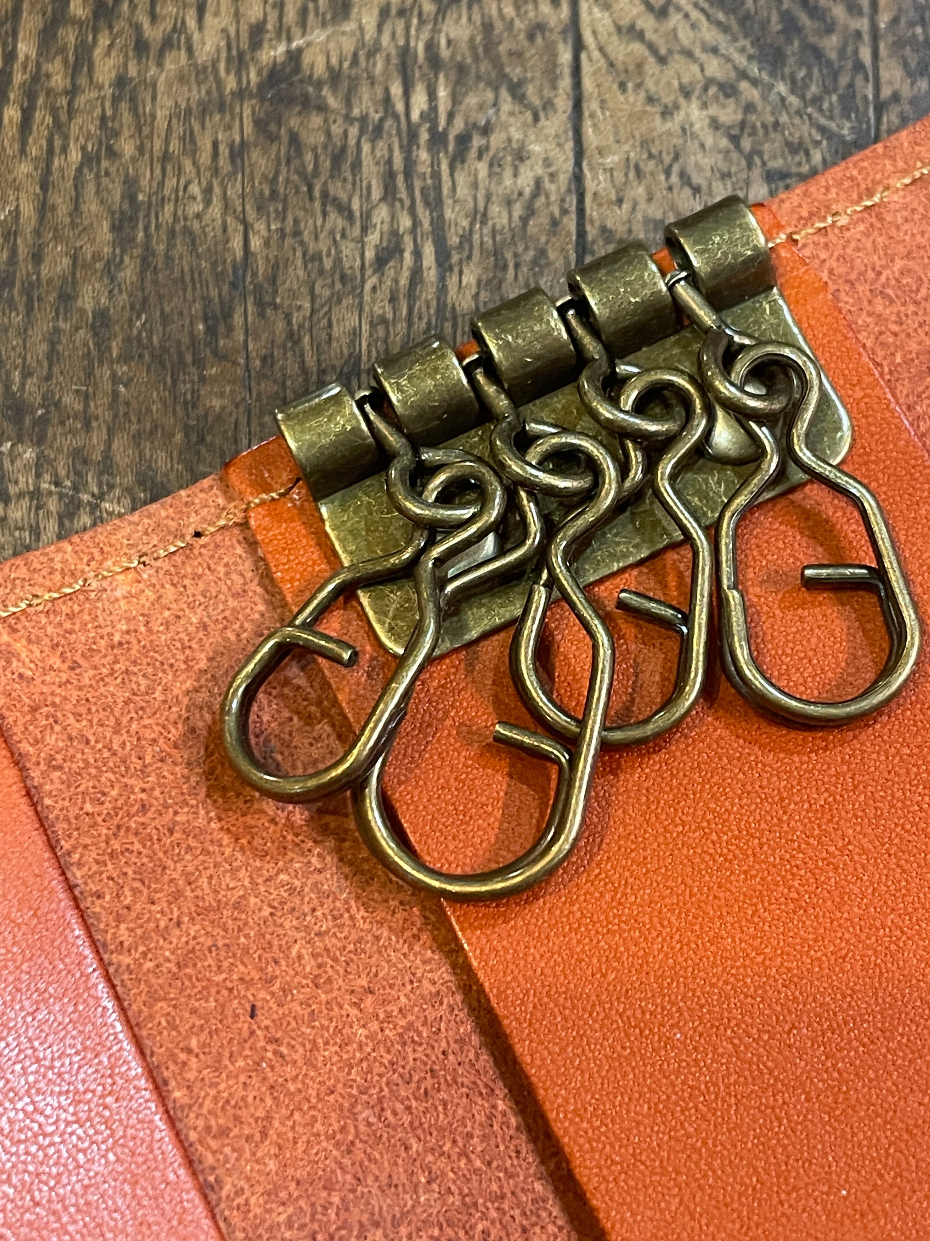 もっともオーソドックスな形、鍵を付ける金具は4連の壊れにくくて着脱が容易なGリングを採用しました。また日常使いのアイテムですので、できるだけ軽くそして強度はしっかりの最適な厚みにした革で制作しました。