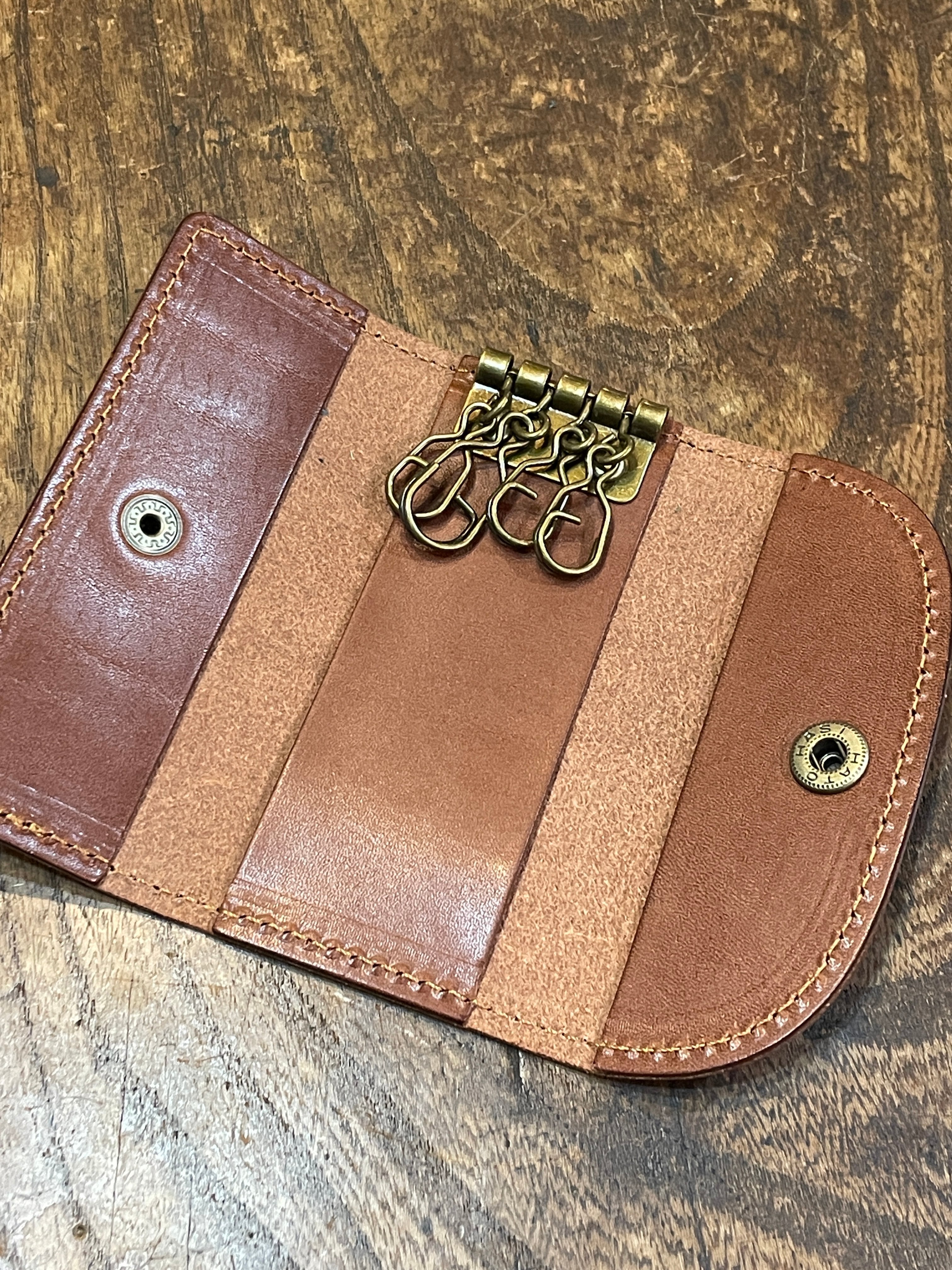 もっともオーソドックスな形、鍵を付ける金具は4連の壊れにくくて着脱が容易なGリングを採用しました。また日常使いのアイテムですので、できるだけ軽くそして強度はしっかりの最適な厚みにした革で制作しました。