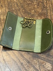 もっともオーソドックスな形、鍵を付ける金具は4連の壊れにくくて着脱が容易なGリングを採用しました。また日常使いのアイテムですので、できるだけ軽くそして強度はしっかりの最適な厚みにした革で制作しました。
