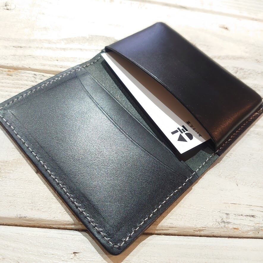 自身の経験を元に、いただいた名刺を一旦入れるためにも重宝するように、広めのポケット以外に3つのポケットをつくりました。シンプルですが機能的なカタチで作りました。