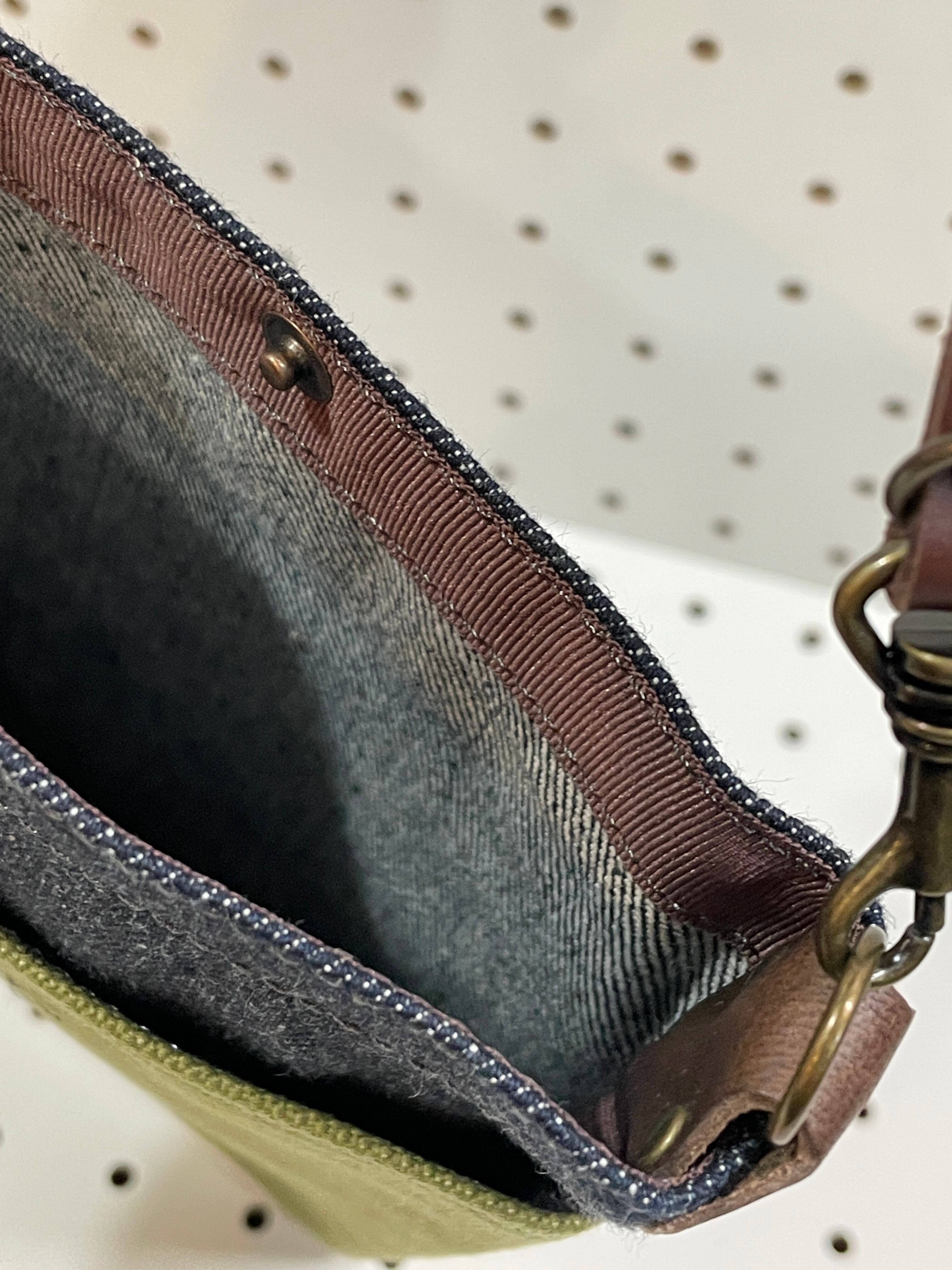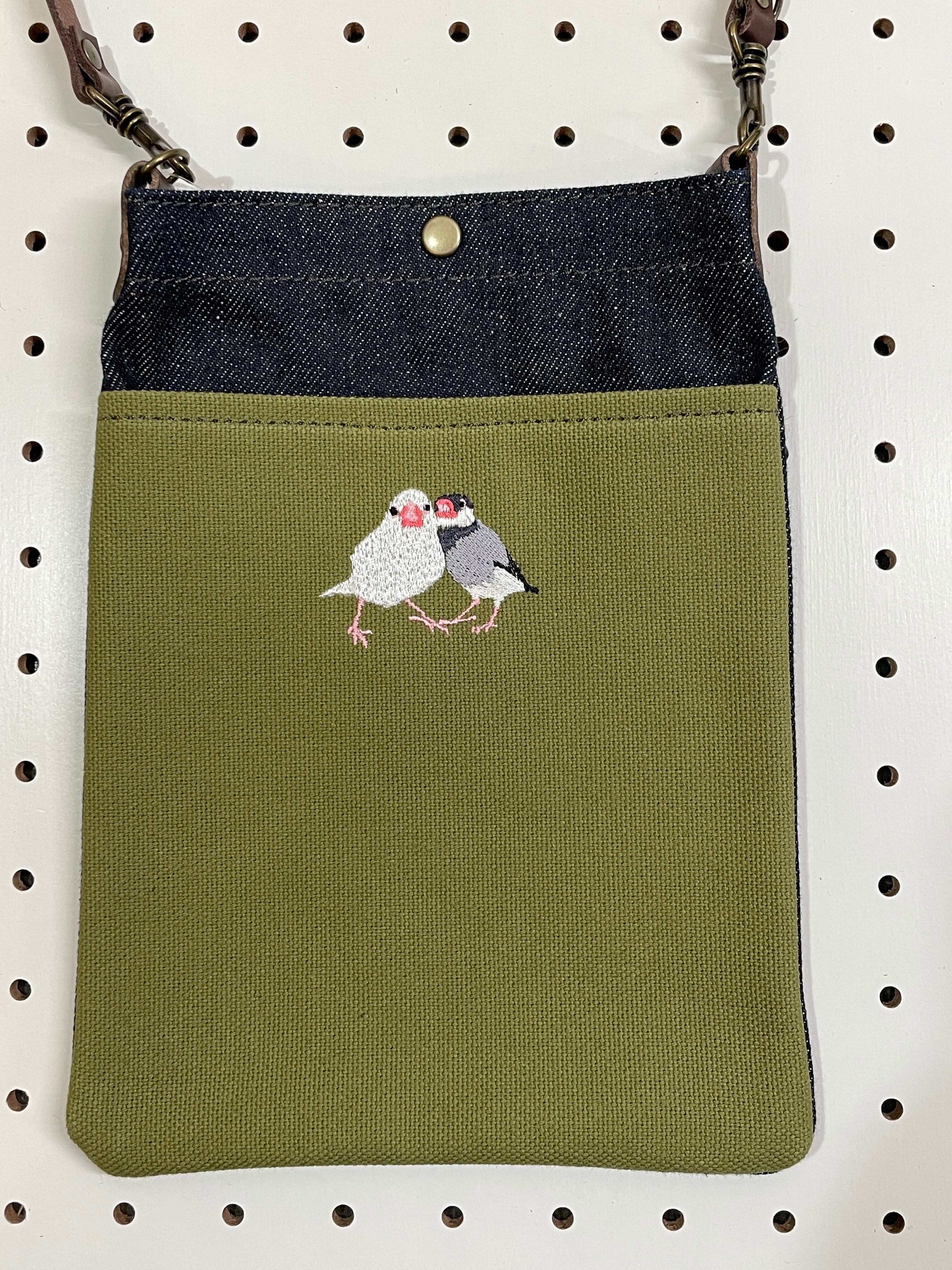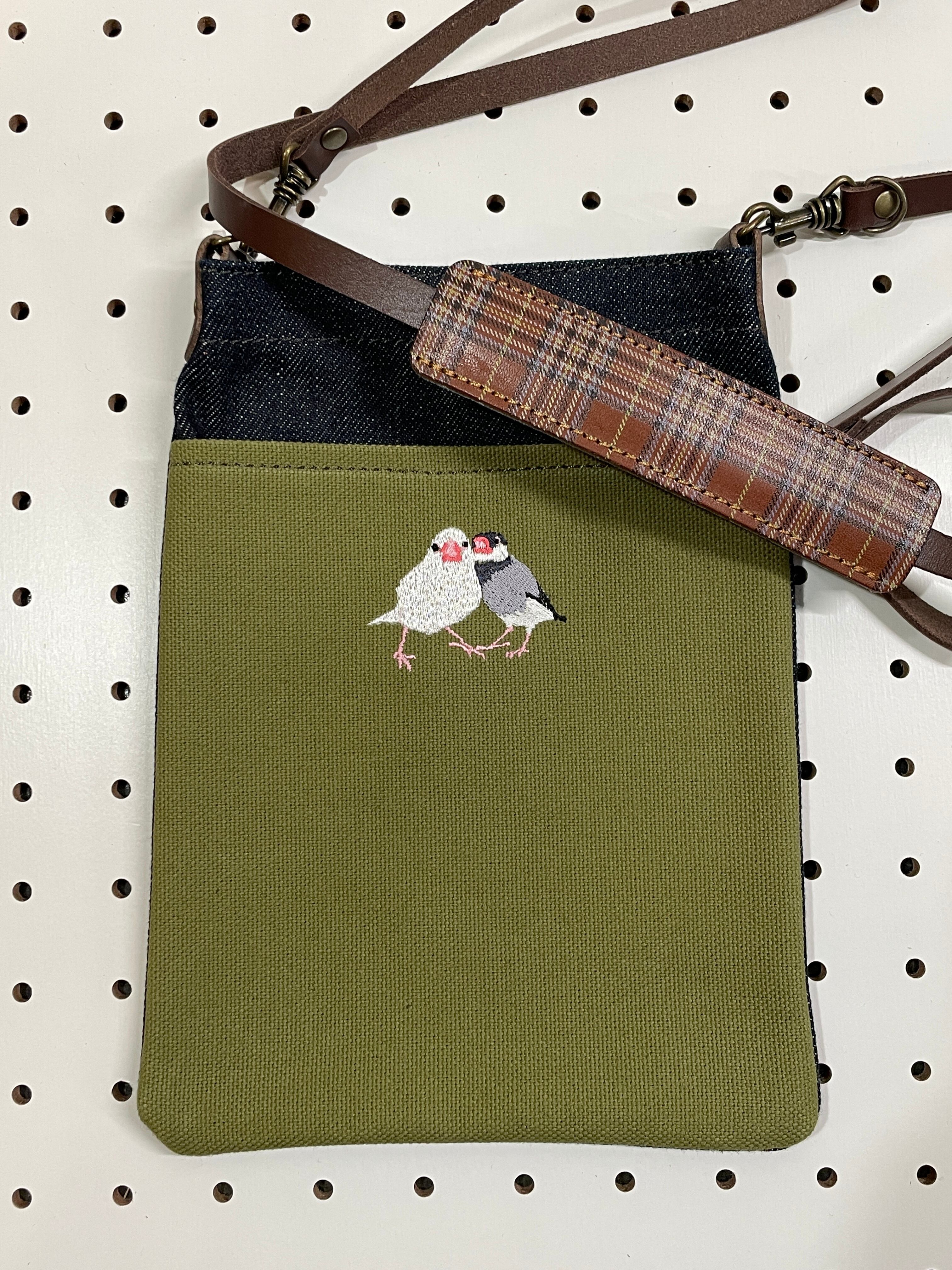 丈夫な8号帆布やセルビッチデニムで作ったスマートフォンがスポッと入るサイズのスマホポシェットです。長財布もギリギリ入るように少し深めにしています。