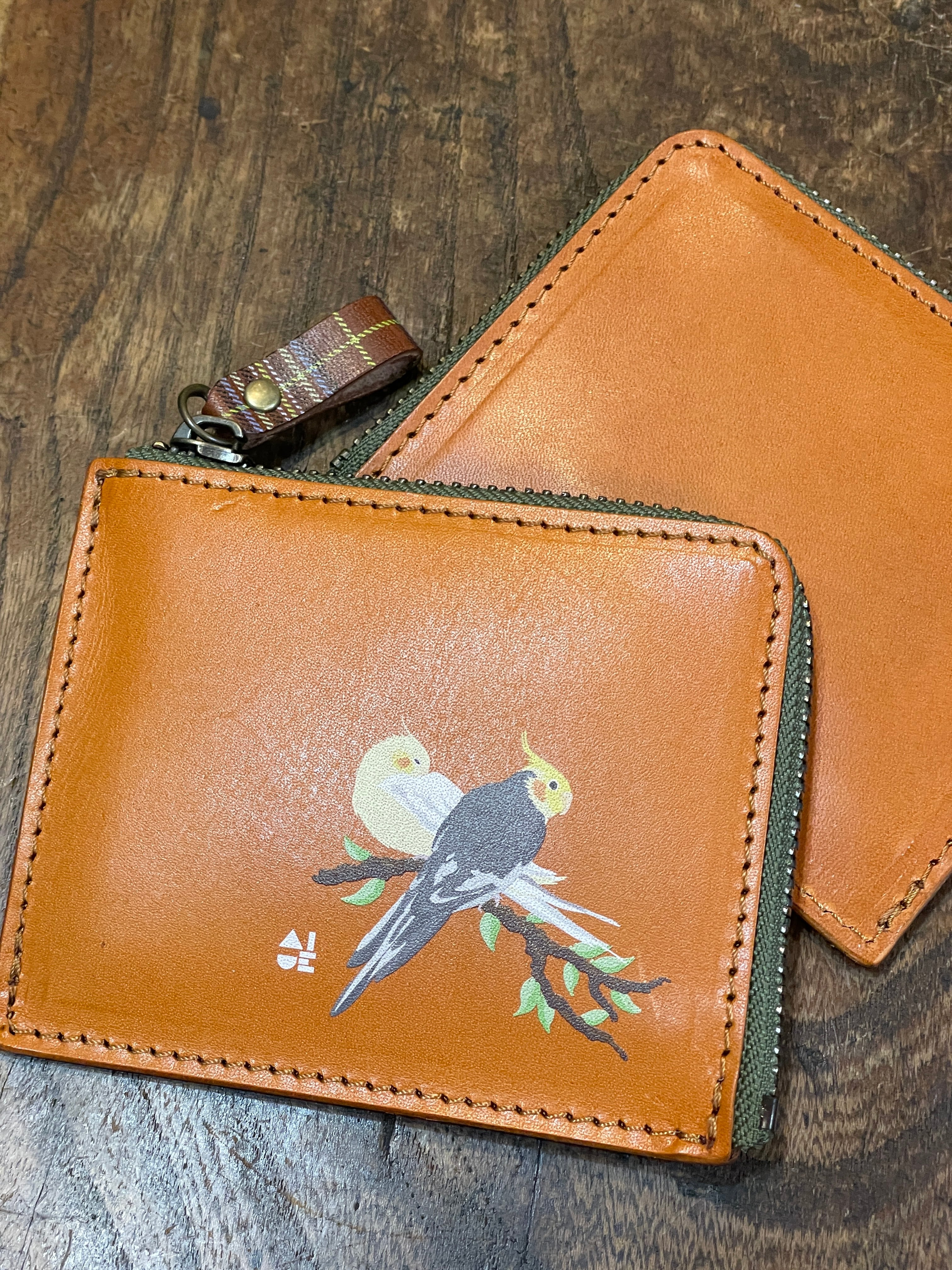 【送料無料】 L字ファスナー財布 キャメル オカメインコ 2羽 ルチノー ノーマル 財布 栃木レザー 枝